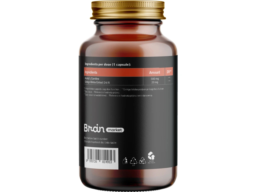 Složení v dávce (1 kapsle): Acetyl L-Karnitin (500 mg, RHP ***), Ginkgo Biloba extrakt 24/6 (20 mg, RHP ***). Rostlinná kapsle na bázi HPMC. Bez obsahu balastních látek.