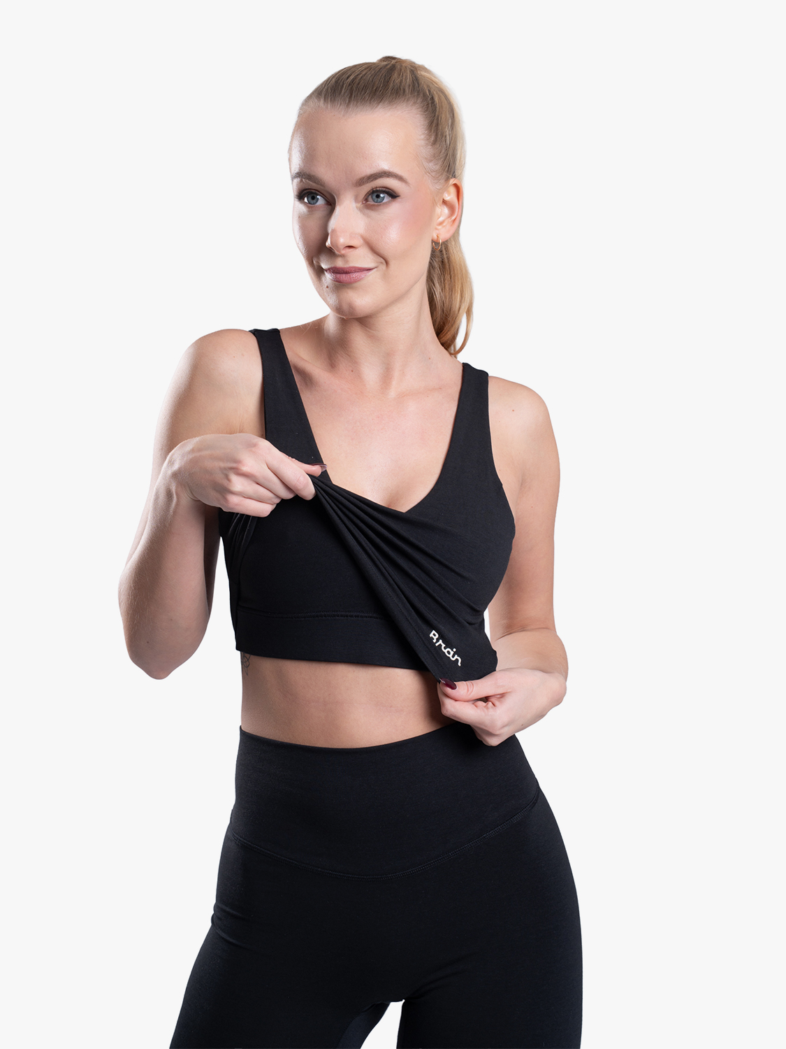 Tato černá sportovní podprsenka pro ženy z bambusu a BIO bavlny vznikla z látky vyvinuté speciálně pro BrainMarket. Spojuje přírodní jemnost, pevnost a prodyšnost, díky které se na těle chová maximálně komfortně a stabilně.