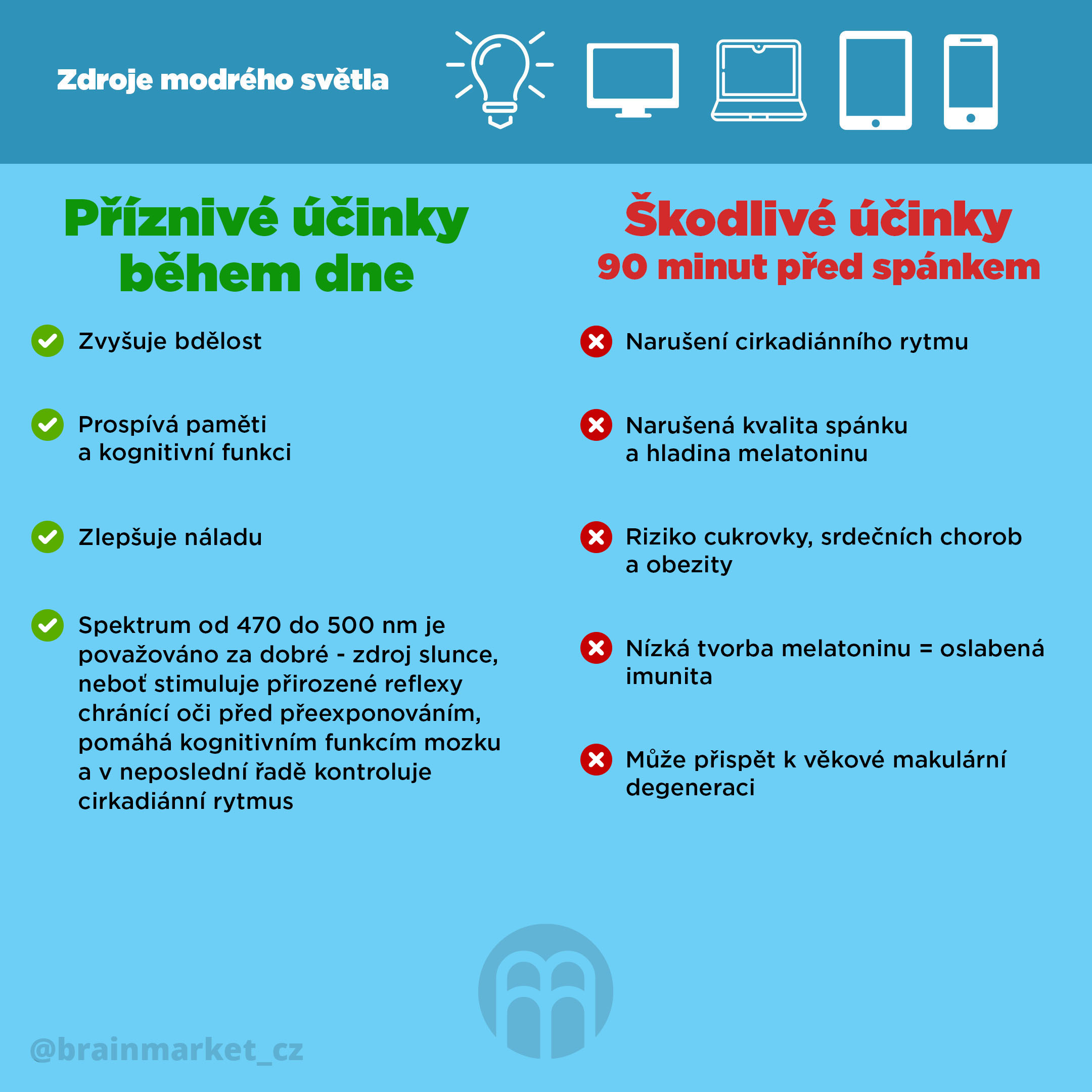 - Vystavení se modrému světlu z obrazovek před spaním narušuje produkci meIatoninu a spánkové vzory.