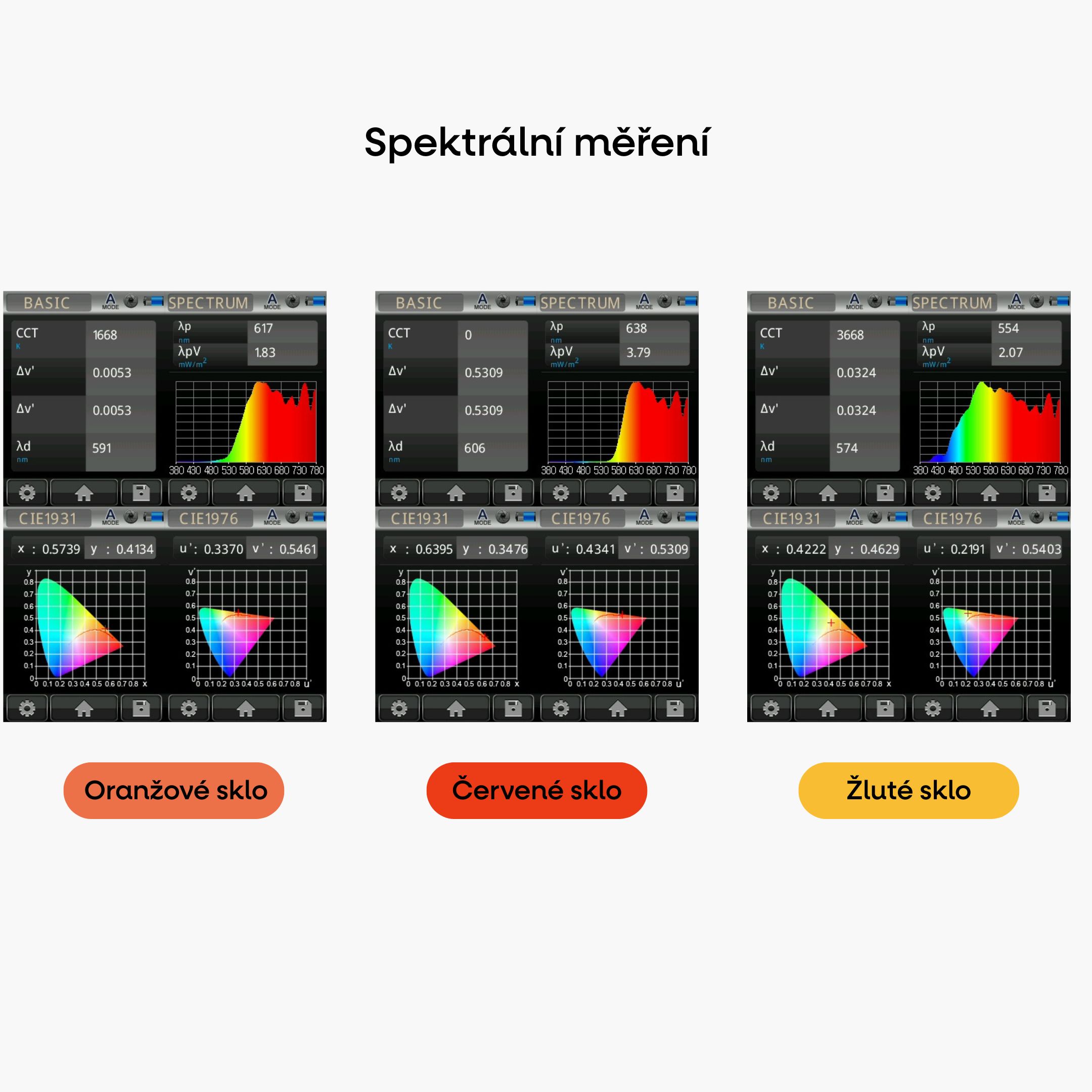 • Oranžové sklo: brýle tak dokáží blokovat 100 % modrého světla (zelené neblokuje). Blokují spektrum o vlnové délce 480 do 617 nm.