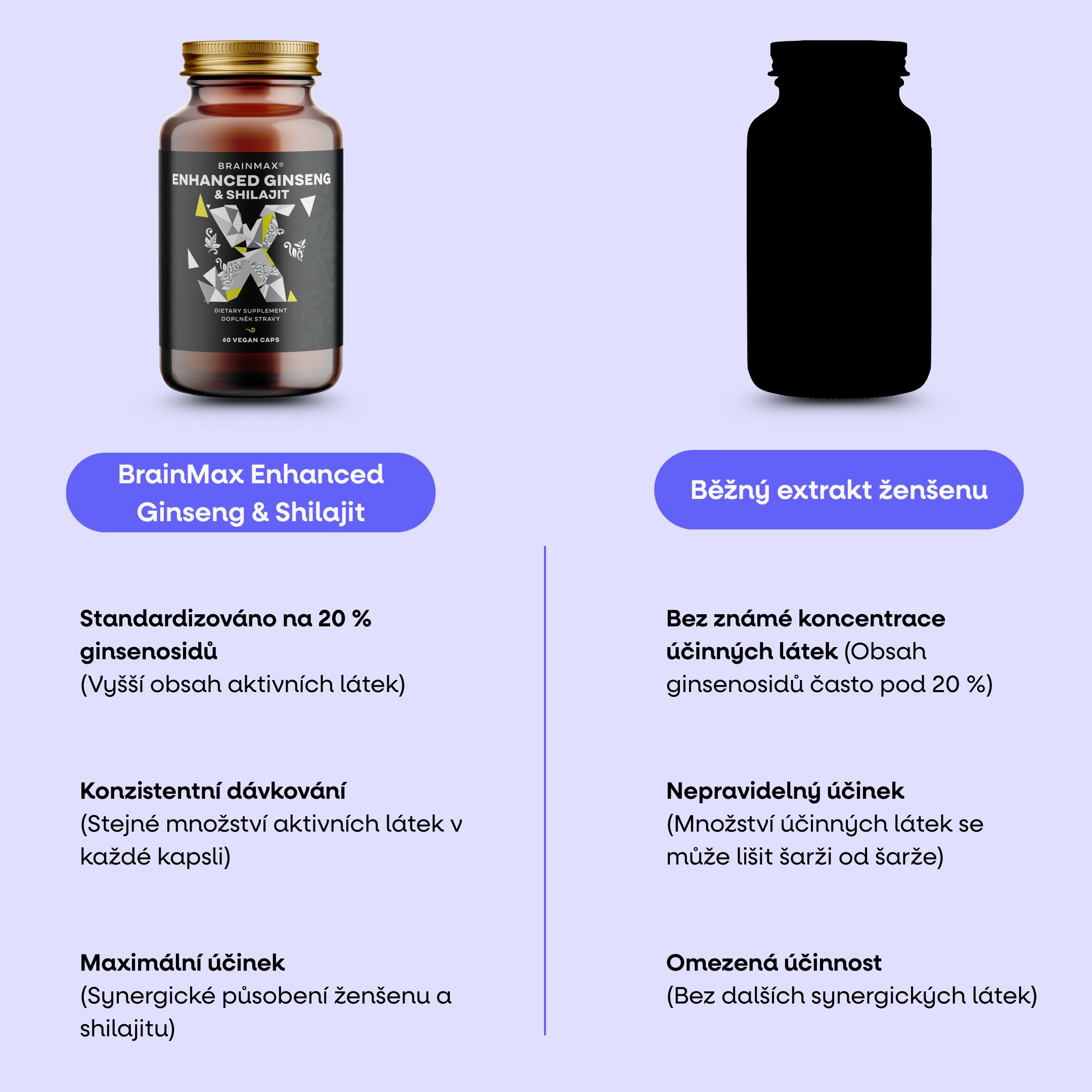 Standardizace je zárukou konzistence a účinku. Znamená, že každá kapsle obsahuje přesně dané množství aktivních látek – v tomto případě 20 % ginsenosidů u korejského ženšenu a 20 % fulvových kyselin u shilajitu. Díky tomu máte jistotu, že produkt nezávisí na proměnlivosti suroviny, ale na přesné kontrole kvality.