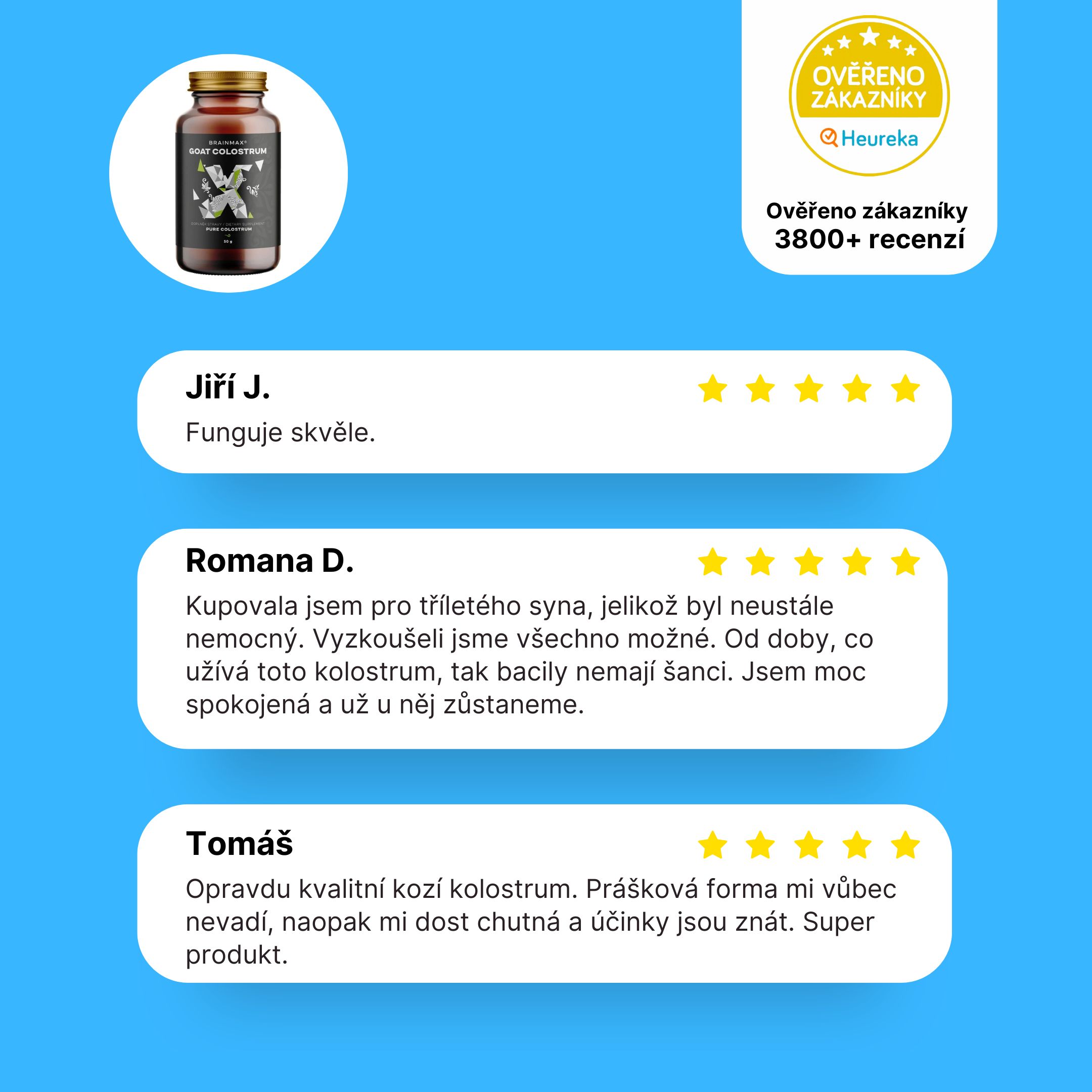 Kozí kolostrum v rostlinných kapslích je unikátní širokou škálou bioaktivních sloučenin jako jsou imunoglobuliny a laktoferiny. Kolostrum je šetrně získáváno z volně pasoucích koz na české farmě. Poté je kolostrum sušeno mrazem (lyofilizace) tak, aby se dalším zpracováním nezničila biologická hodnota kolostra. To vše s maximálním důrazem na čistotou. Díky přirozeně nízkému obsahu laktózy a použití rostlinných kapslí je tento produkt oblíbenou volbou i mezi lidmi, kteří běžné mléčné výrobky snášejí hůře. V produkci je dodržený etický postup, který zaručuje, že první dávku kolostra dostávají kůzlata a poté je šetrně odebráno pro vlastní spotřebu.