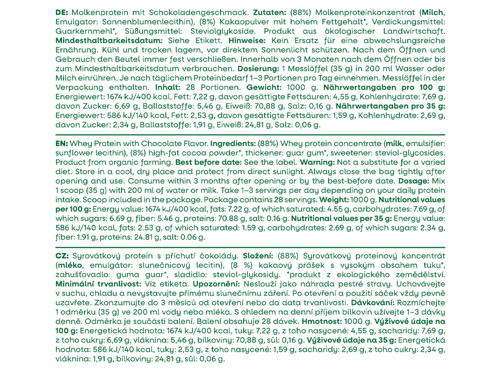 Složení: (88 %) syrovátkový proteinový koncentrát (mléko, emulgátor: slunečnicový lecitin), (8 %) kakaový prášek s vysokým obsahem tuku*, zahušťovadlo: guma guar*, sladidlo: steviol-glykosidy. *produkt z ekologického zemědělství.