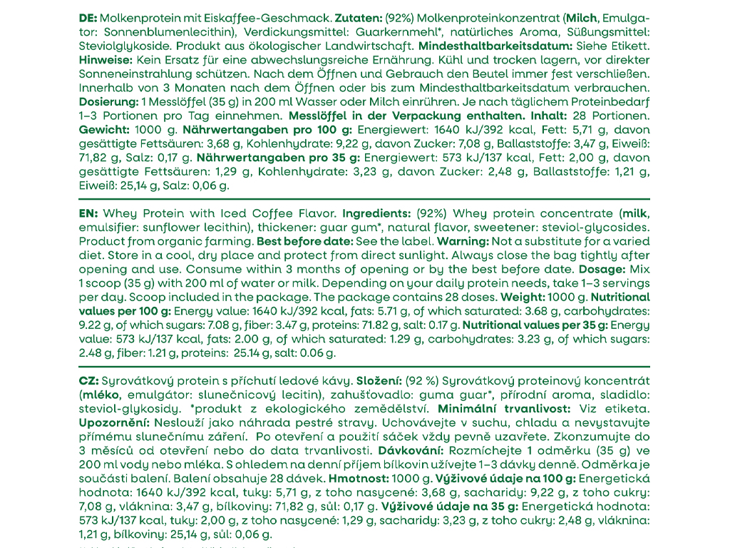 Složení: (92 %) syrovátkový proteinový koncentrát (mléko, emulgátor: slunečnicový lecitin), zahušťovadlo: guma guar*, přírodní aroma, sladidlo: steviol-glykosidy. *produkt z ekologického zemědělství.