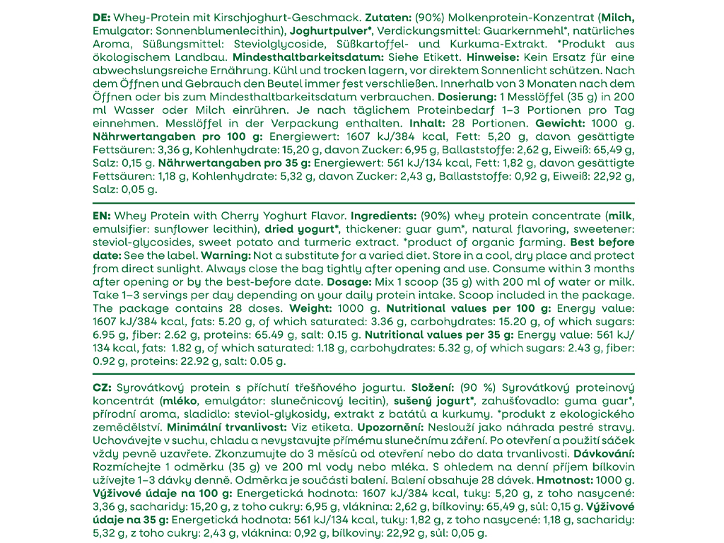 Složení: (90 %) syrovátkový proteinový koncentrát (mléko, emulgátor: slunečnicový lecitin), sušený jogurt*, zahušťovadlo: guma guar*, přírodní aroma, sladidlo: steviol-glykosidy, extrakt z batátů a kurkumy. *produkt z ekologického zemědělství.