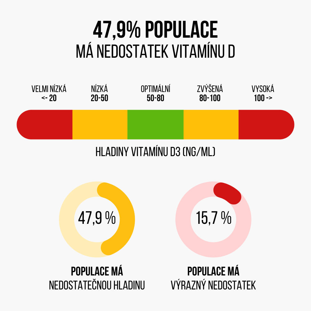 Nedávný globálním průzkum1 ukázal, že téměř polovina populace (47,9 %) měla hladinu nižší než 50 nmol/L, což naznačuje nedostatečnou hladinu vitamínu D, zvlášť v chladnějších obdobích roku. Akutní nedostatek vitamínu D mělo 15,7 % lidí. Ti měli hladinu vitamínu D nižší než 30 nmol/L, což značí výrazný nedostatek.