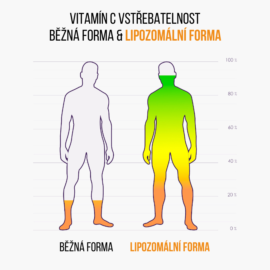 Tato inovativní směs zvyšuje biologickou dostupnost vitamínu C, což je zásadní pro posílení imunitního systému. Bioflavonoidy podporují zdraví cév a synergicky působí s vitamínem C, čímž zajišťují jeho maximální účinnost. Vitamín C má na práci imunitního systému velký vliv, protože podporuje produkci bílých krvinek a jejich rychlost při napadení patogeny. Díky své struktuře lipozomy chrání vitamín před rozkladem v trávicím systému a umožňují jejich přímý transport do buněk. Tyto lipozomy, lépe řečeno fosfatidylcholin, ze kterého je lipozom vyroben, následně využije tělo k výrobě nových buněk. Použitím lipozomální technologie se zvyšuje biologická dostupnost vitamínu C, což znamená, že tělo získá více živin z každé dávky ve srovnání s běžnými formami.16,17,18