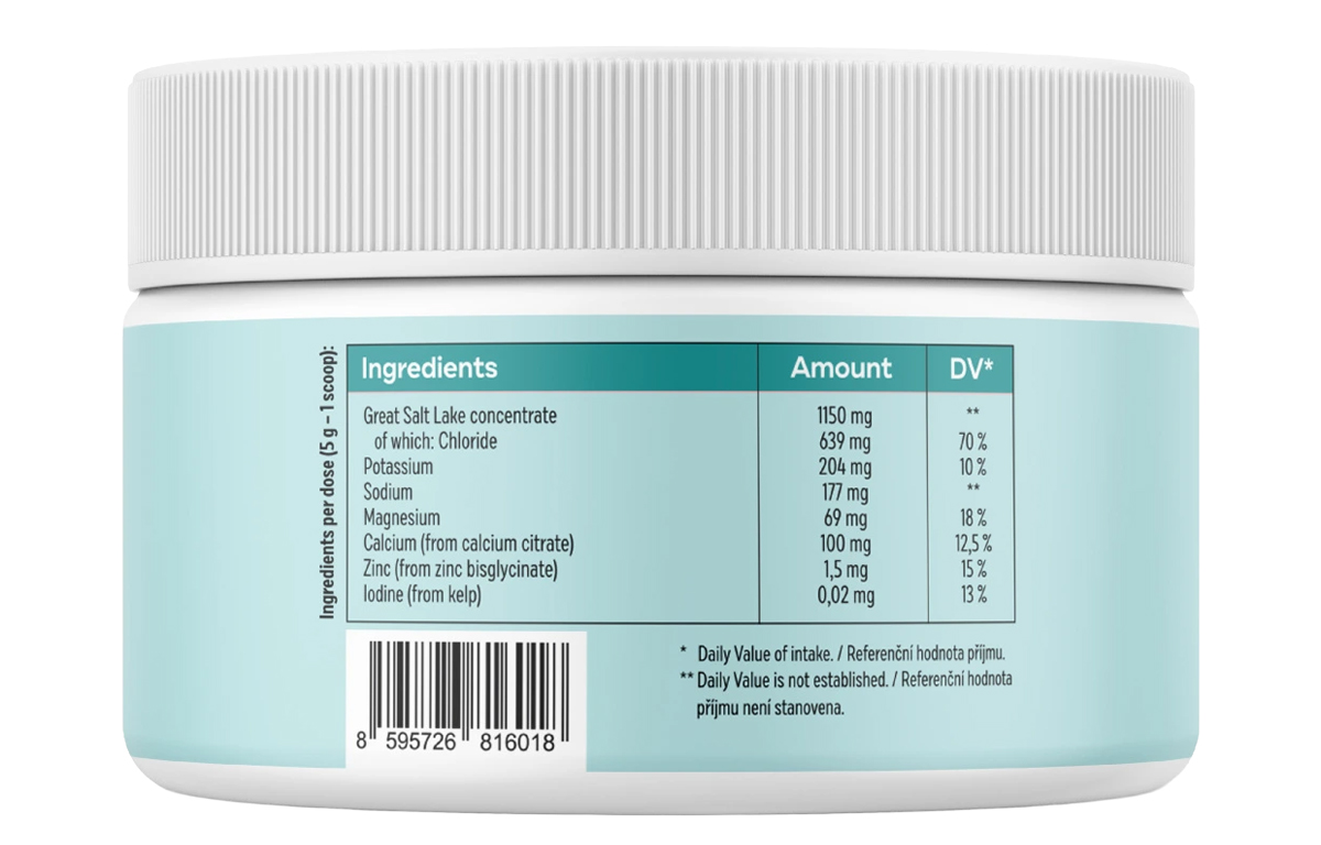 Složení: Inulin, koncentrát z Velkého solného jezera (1150 mg, RHP **), z toho chlorid (639 mg, RHP 70 %), draslík (204 mg, RHP 10 %), sodík (177 mg, RHP **), hořčík (69 mg, RHP 18 %), přírodní aroma, lyofilizovaný malinový prášek, stabilizátor: kyselina citronová, vápník (jako citrát vápenatý) (100 mg, RHP 12,5 %), zinek (jako zinek bisglycinát) (1,5 mg, RHP 15 %), jód (jako extrakt z kelpu – Laminaria japonica Aresch) (0,02 mg, RHP 13 %), sladidlo: steviol-glykosidy z fermentace.
