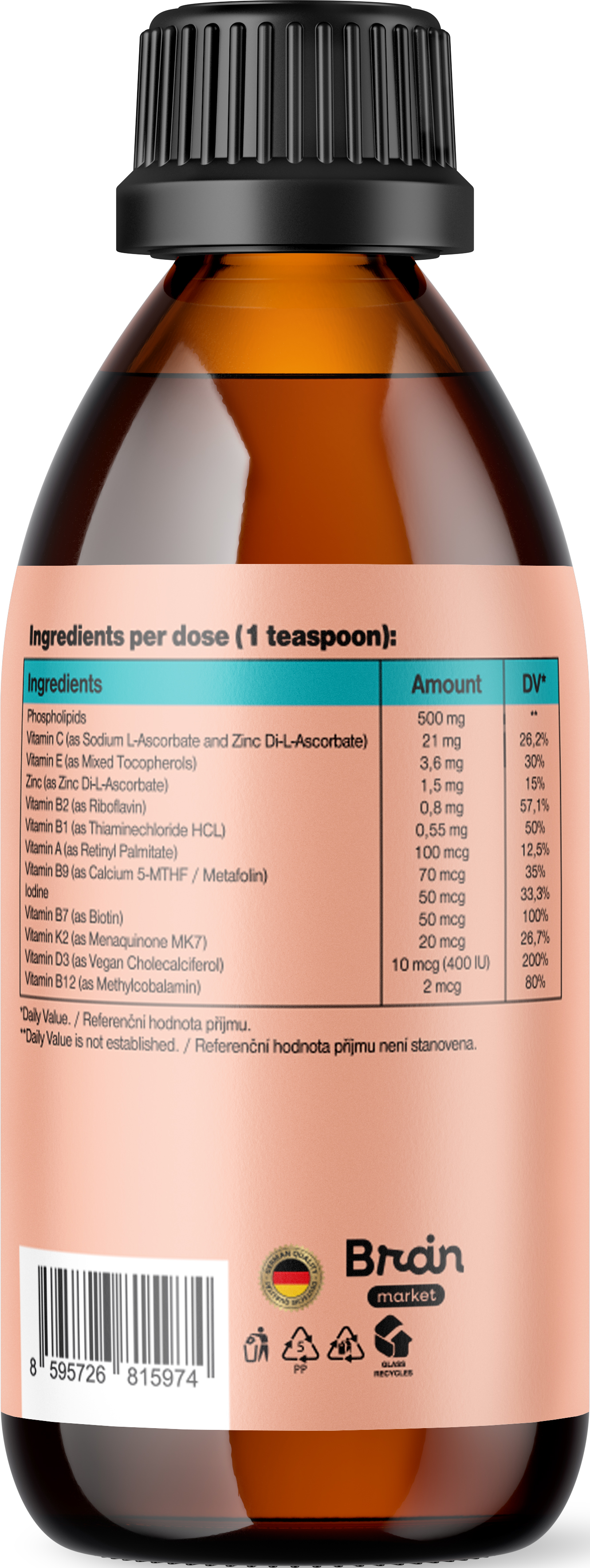 Složení na 5 ml (čajová lžička): Voda, glycerol (přírodní stabilizátor), mango aroma, fosfolipidy (slunečnicový lecithin) (500 mg, RHP **), Vitamin C (jako Sodium L-Ascorbate a Zinc L-Ascorbate) (21 mg, RHP 26,2 %), Vitamin E (jako Mixed Tocopherols) (3,6 mg, RHP 30 %), Zinek (jako Zinc L-Ascorbate) (1,5 mg, RHP 15 %), kyselina citronová monohydrát, Vitamin B2 (jako Riboflavin) (0,8 mg, RHP 57,1 %), Vitamin B1 (jako Thiaminechloride HCL) (0,55 mg, RHP 50 %), Vitamin A (jako Retinyl Palmitate) (100 mcg, RHP 12,5 %), Vitamin B9 (jako Calcium 5-MTHF / Metafolin) (70 µg, RHP 35 %), Jód (jako Potassium Iodide) (50 µg, RHP 33,3 %), Vitamin B7 (jako Biotin) (50 µg, RHP 100 %), Vitamin K2 (jako Menaquinone MK7) (20 µg, RHP 26,7 %), Vitamin D3 (jako Vegan Cholecalciferol) (10 µg, RHP 200 %), extrakt z rozmarýnu (kyselina karnozová +), Vitamin B12 (jako Methylcobalamin) (2 µg, RHP 80 %).