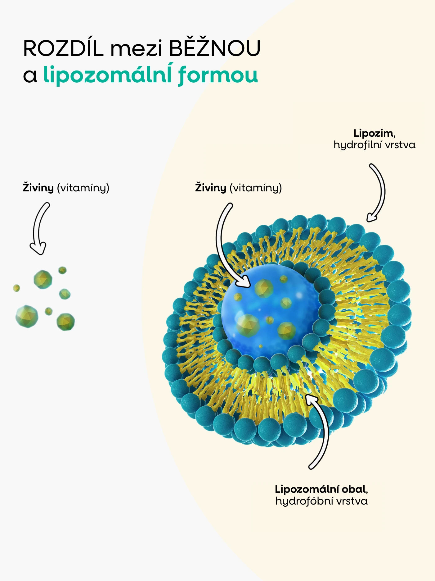 Lipozomy jsou složeny z přírodních fosfolipidů, které jsou základními stavebními kameny všech našich buněk, proto přes stěny buněk prochází zcela bez problému tzv. pasivním transportem. Přirozeně se lipozomy vyskytují např. v kolostru a mateřském mléce, kde je maximální absorpce a využitelnost naprosto nezbytná. Díky své struktuře lipozomy chrání vitamíny před rozkladem v trávicím systému a umožňují jejich přímý transport do buněk. Tento způsob dodání zvyšuje biologickou dostupnost vitamínů, což znamená, že tělo získá více živin z každé dávky ve srovnání s běžnými formami doplňků.