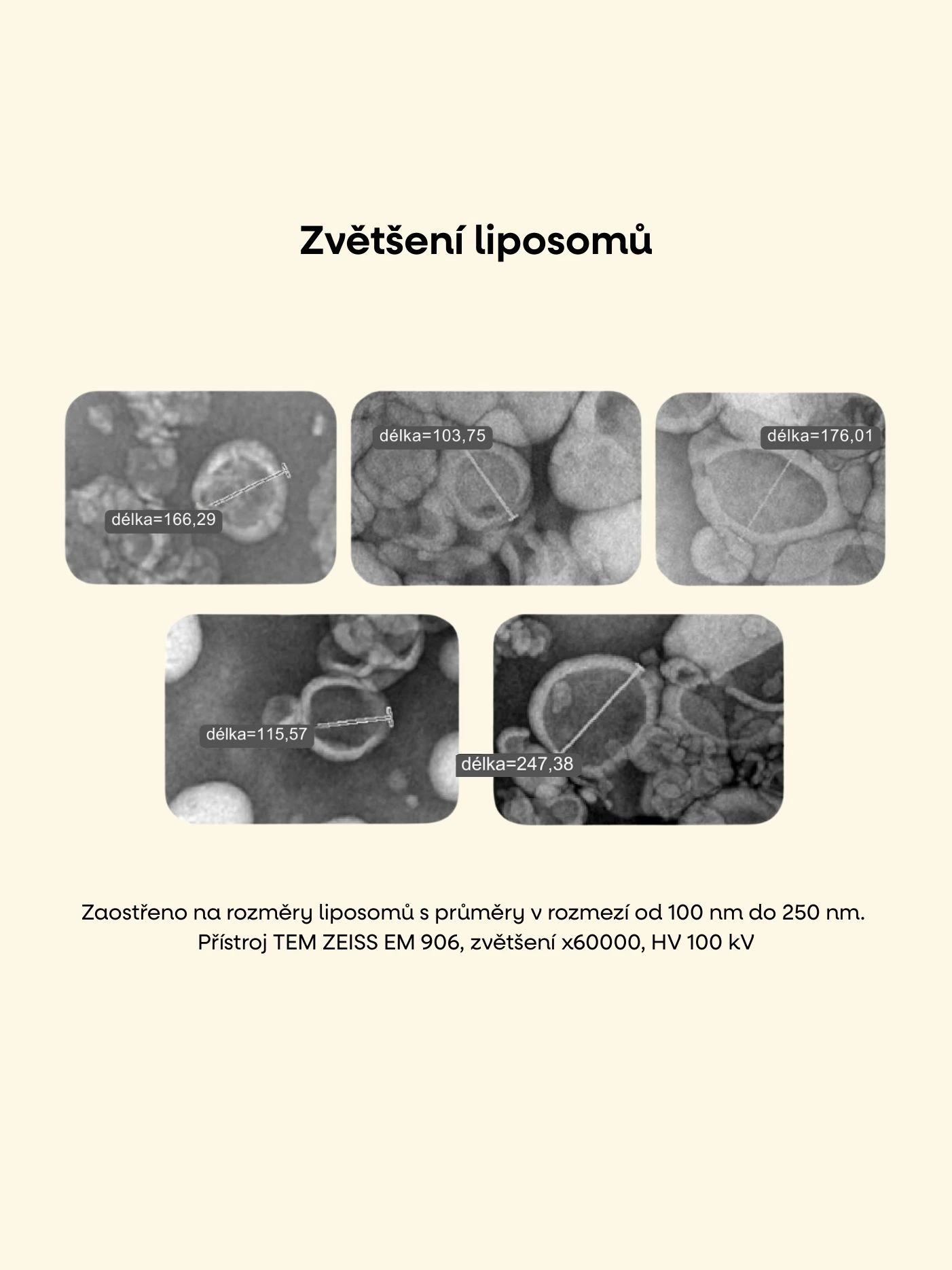 Naše lipozomální doplňky jsou přesně analyzovány na velikost a stabilitu, což zaručuje optimální vstřebávání živin. Používáme moderní technologii TEM, která umožňuje detailní vizualizaci a kontrolu struktury liposomů, aby si zachovaly své unikátní vlastnosti. Na rozdíl od jiných liposomálních produktů, které často nedosahují požadované stability nebo účinnosti, naše technologie garantuje, že vitamín C a zinek zůstanou chráněni a děti je dokážou maximálně využít.