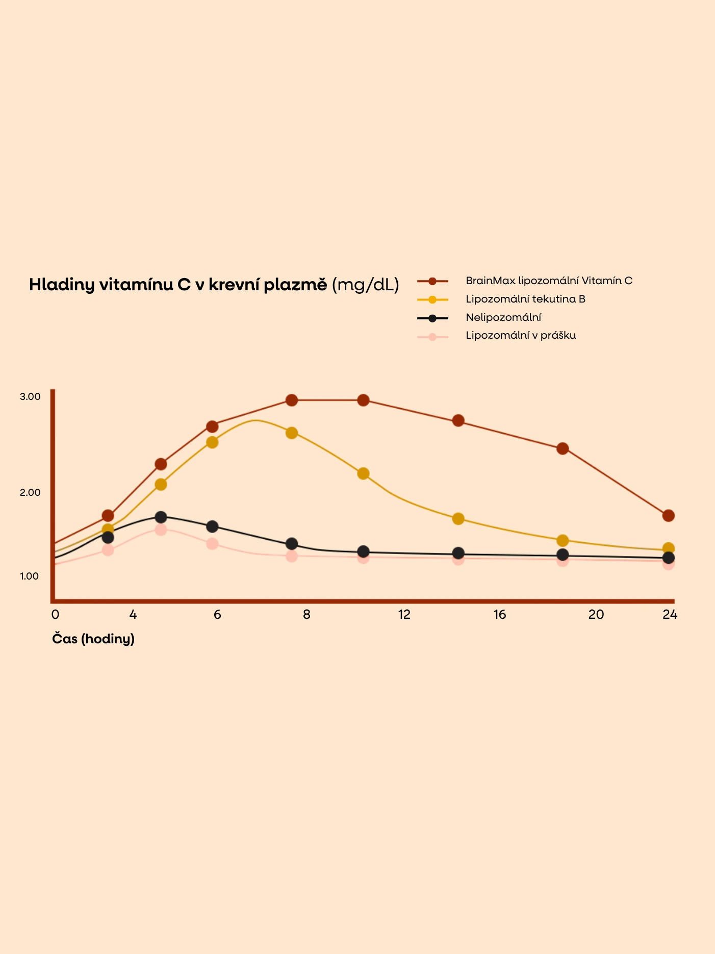 Studie potvrdila, že vitamín C v našem lipozomálním doplňku má až 21× vyšší biologickou dostupnost než jiné formy vitamínu C. Díky unikátní liposomální technologii dokáže udržet stabilní hladinu vitamínu C v krvi po dobu celých 24 hodin, zatímco práškové nebo neliposomální formy klesají k základním hodnotám už po několika hodinách. Ve srovnání s jinými liposomálními produkty měl náš doplněk téměř dvojnásobně vyšší vstřebatelnost, což potvrzuje jeho kvalitu i účinnost.
