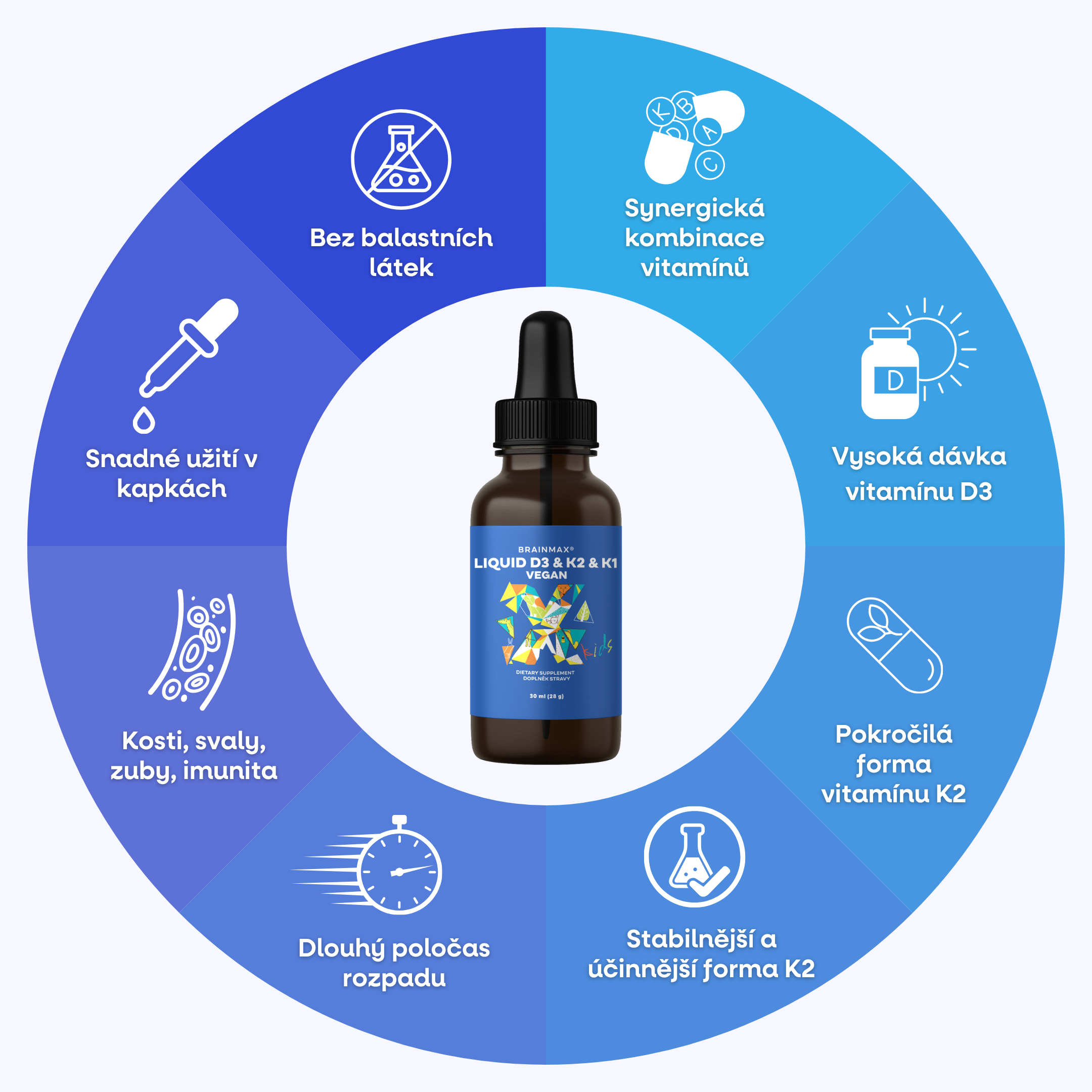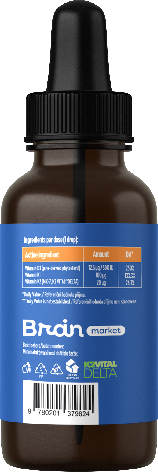 BrainMax KIDS Vegan Liquid D3 & K2 & K1 spojuje klíčové vitamíny pro každodenní vývoj dítěte. D3 z borovice, K2 jako MK-7 v patentované formě K2Vital®Delta a K1 v dokonale vyváženém poměru a 100% rostlinné formě. Jednoduché, minimalistické dávkování, maximální kvalita a čistota produktu, díky bázi v MCT oleji z kokosu, který pomáhá vstřebatelnosti těchto vitamínů. Jediná kapka denně přináší kvalitu a jistotu, že dětský organismus dostává přesně to, co potřebuje.