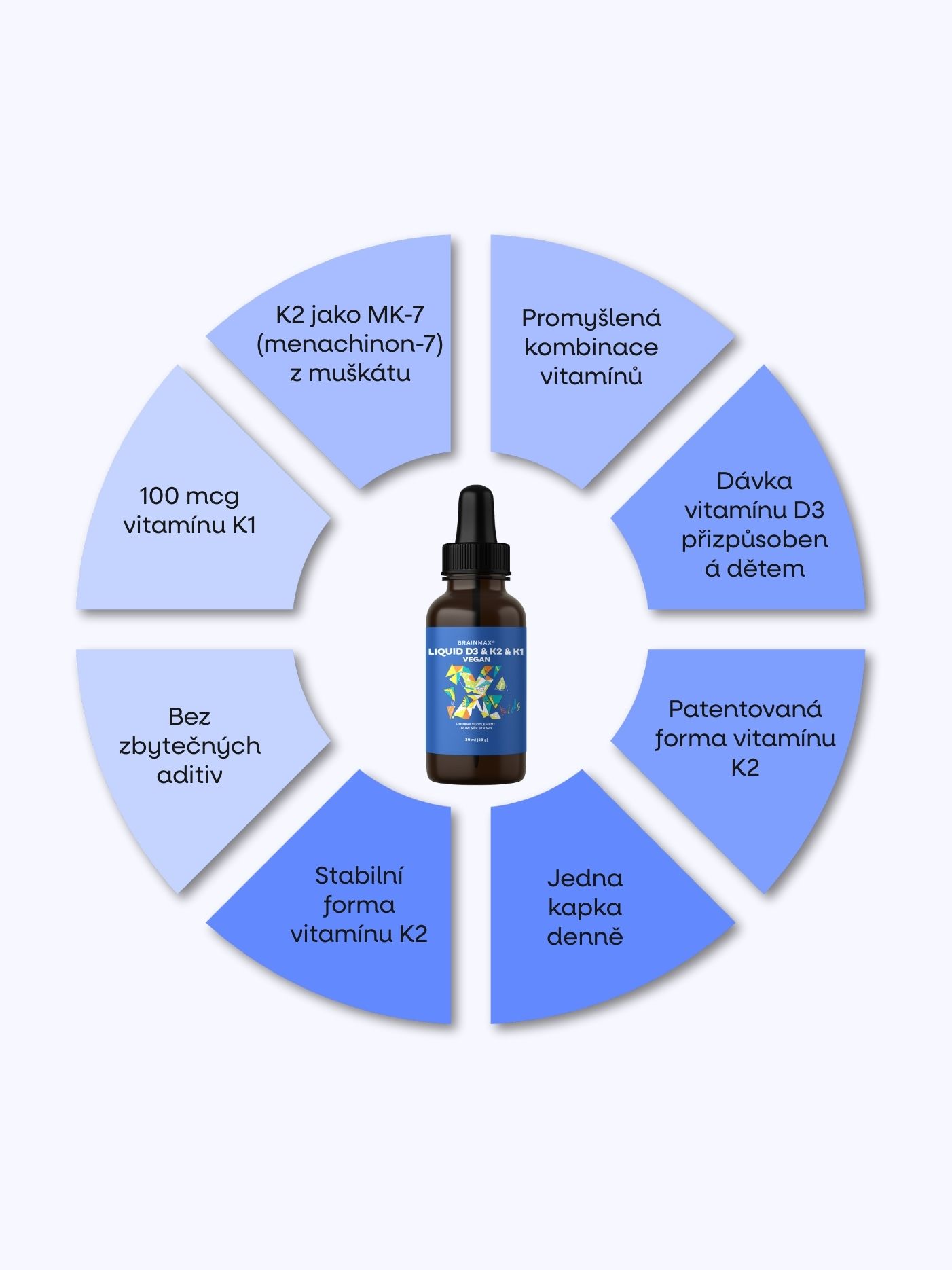 Proč nestačí jen D3 a K2? Vitamín K1 hraje důležitou roli v podpoře normální srážlivosti krve, tedy přirozeného procesu, který je zásadní už od raného dětství. Je běžnou součástí výživy novorozenců a dětí a jeho přítomnost pomáhá zajistit, že organismus funguje v rovnováze. Právě proto jsme k vitamínům D3 a K2 přidali i vitamín K1, aby byl produkt komplexní a podpořil přirozené fyziologické potřeby dětského těla.