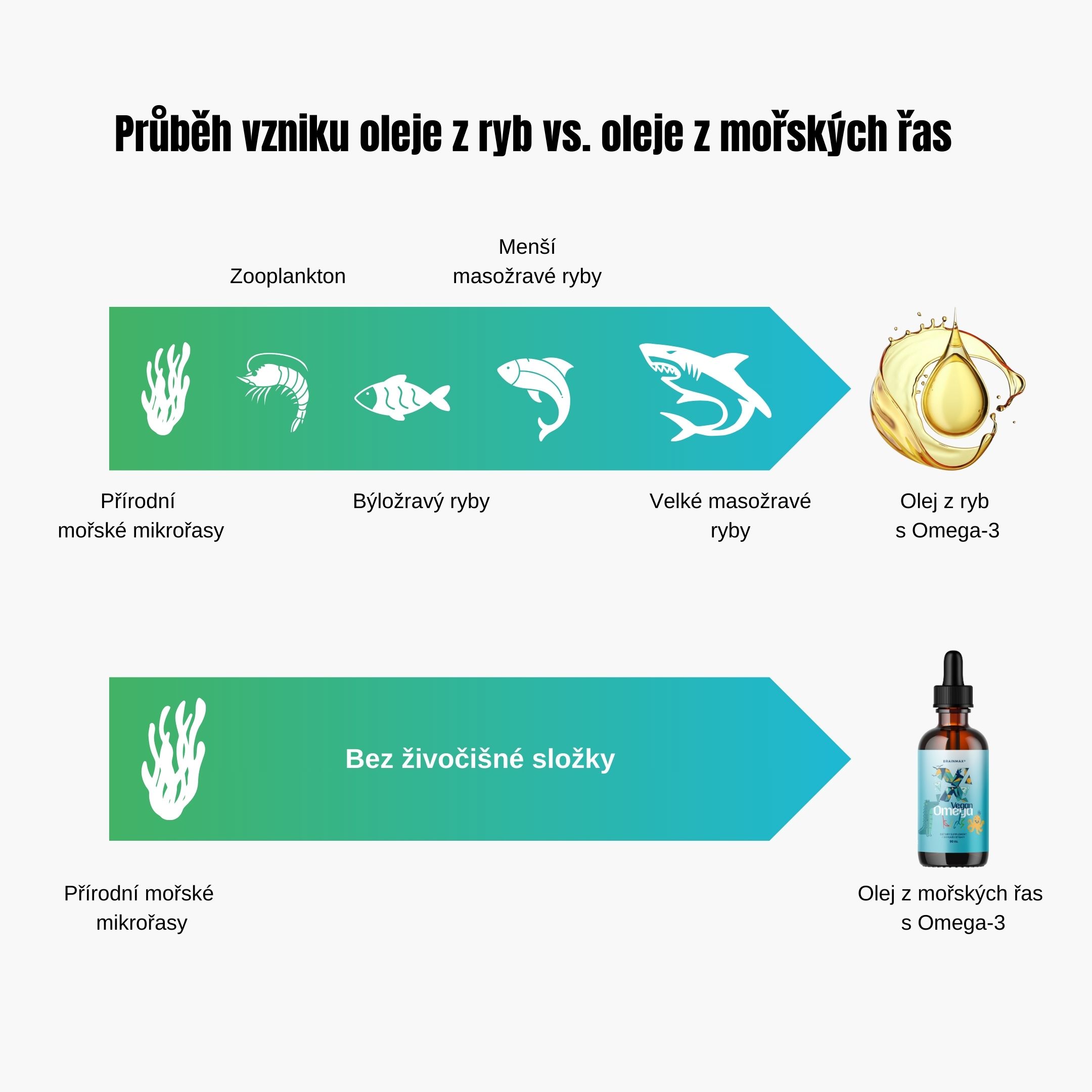 - Produkce řas algae je také ekologicky šetrná, což znamená, že nepřispívá k nadměrnému vyčerpání populací ryb a nezpůsobuje degradaci mořských ekosystémů, jak je tomu u tradičního rybolovu. Tento faktor z něj činí udržitelnější volbu pro zdraví planety i nás samotných.
