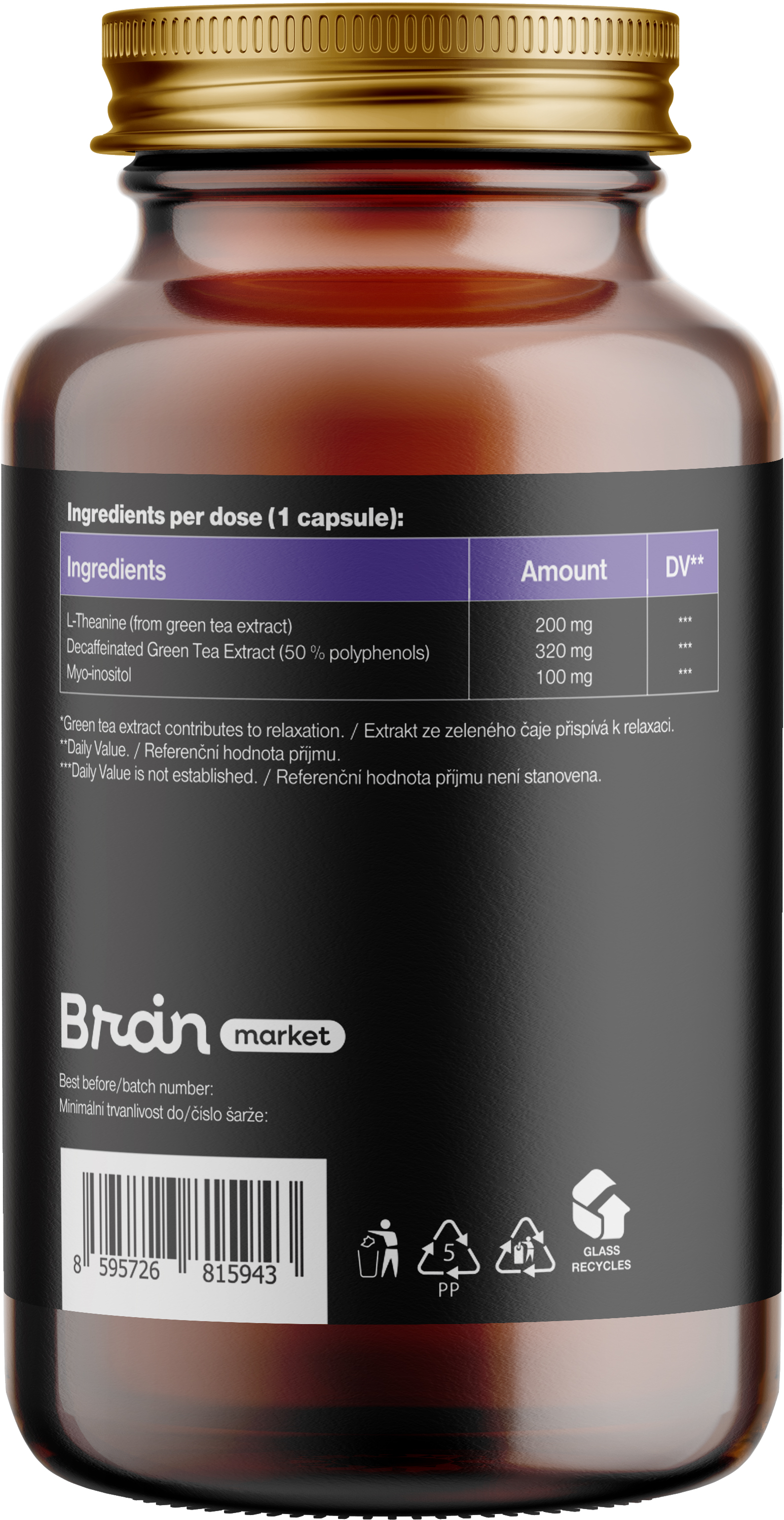 Složení: L-Theanin (z extraktu zeleného čaje) (200 mg, RHP ***), bezkofeinový extrakt ze zeleného čaje (50 % polyfenolů) (320 mg, RHP ***), Myo-Inositol (100 mg, RHP ***), rostlinná kapsle na bázi HPMC. Neobsahuje žádné balastní látky (éčka).