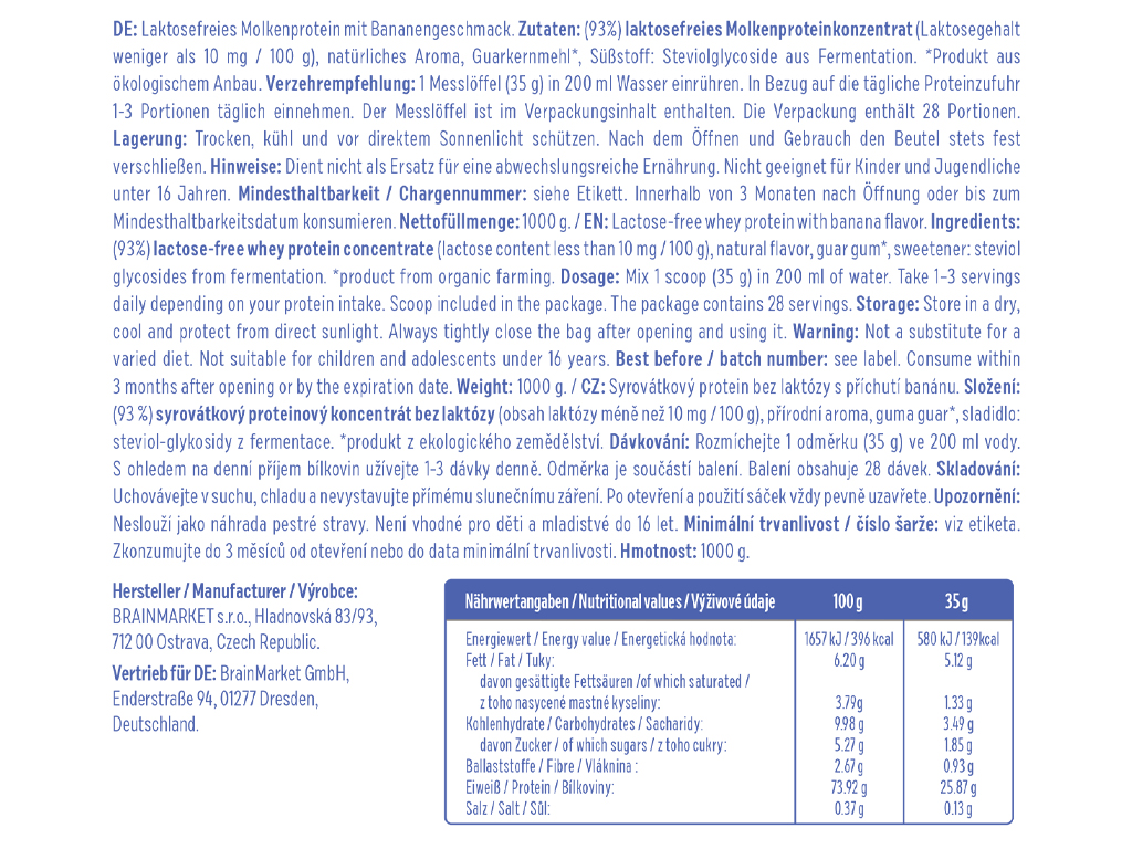 Bezlaktózové proteiny BrainMax tvoří z 93 % syrovátkový proteinový koncentrát, který nabízí výjimečně vysoký obsah bílkovin a skvělou stravitelnost. Díky tak velkému obsahu proteinu a čistému složení bez zbytečných surovin obsahuje v jedné dávce skoro 26 g bílkovin. Je slazen stévií a ochucen přírodním banánovým aromatem. Bez umělých sladidel, plnidel a konzervantů. Výsledkem je lehký, výživný a chutný protein, který tělo snadno využije.