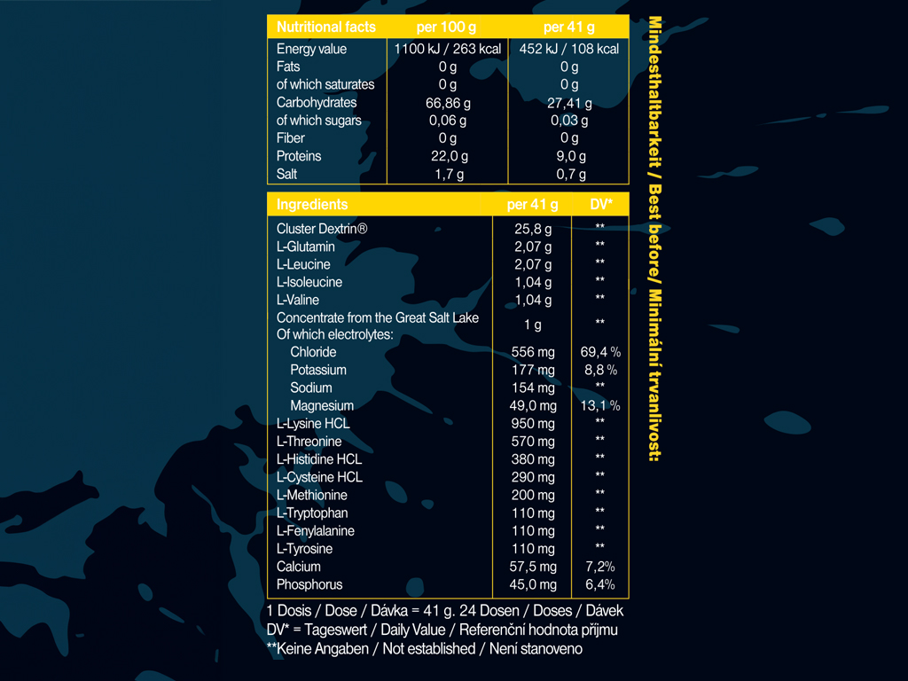 Složení: Cluster Dextrin®, L-glutamin , L-leucin, L-isoleucin, L-valin, elektrolyty a stopové prvky z Velkého Solného jezera v Utahu chlorid, draslík, sodík, hořčík a přirozeně se vyskytující elektrolyty a stopové minerály), L-Cystein HCl, L-Treonin, L-Histidin HCl, L-Fenylalanin, L-Methionin, L-Tryptofan, L-Tyrosin, regulátor kyselosti: kyselina citronová, fosforečnan vápenatý, přírodní aroma mango, sladidlo: steviol-glykosidy