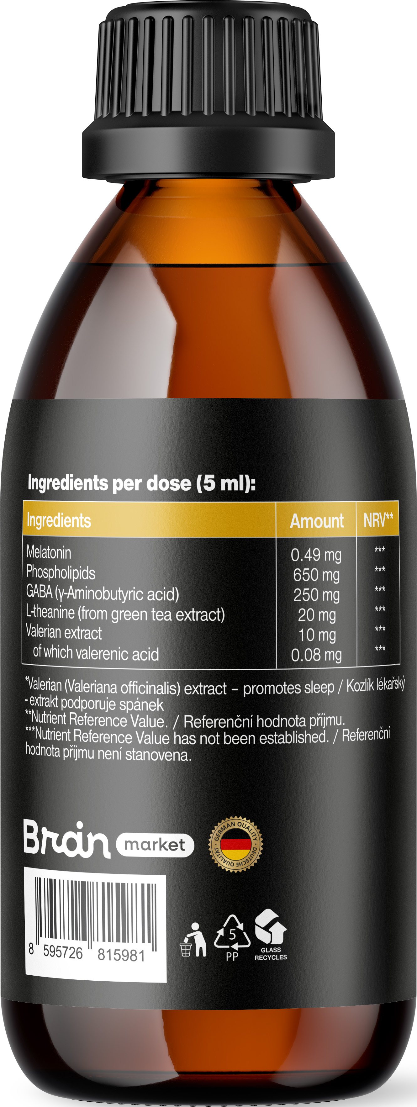 Složení: Voda, glycerol, fosfolipidy (650 mg, NRV *), GABA (kyselina γ-aminomáselná) (250 mg, NRV *), kyselina citronová, L-theanin (z extraktu zeleného čaje) (20 mg, NRV *), aroma žlutý meloun, extrakt z kozlíku lékařského (10 mg, NRV *) z toho kyselina valerenová (0,08 mg, NRV *), extrakt z rozmarýnu (0,68 mg, NRV *) z toho karnosová kyselina (0,4 mg, NRV *), melatonin (0,49 mg, NRV *).