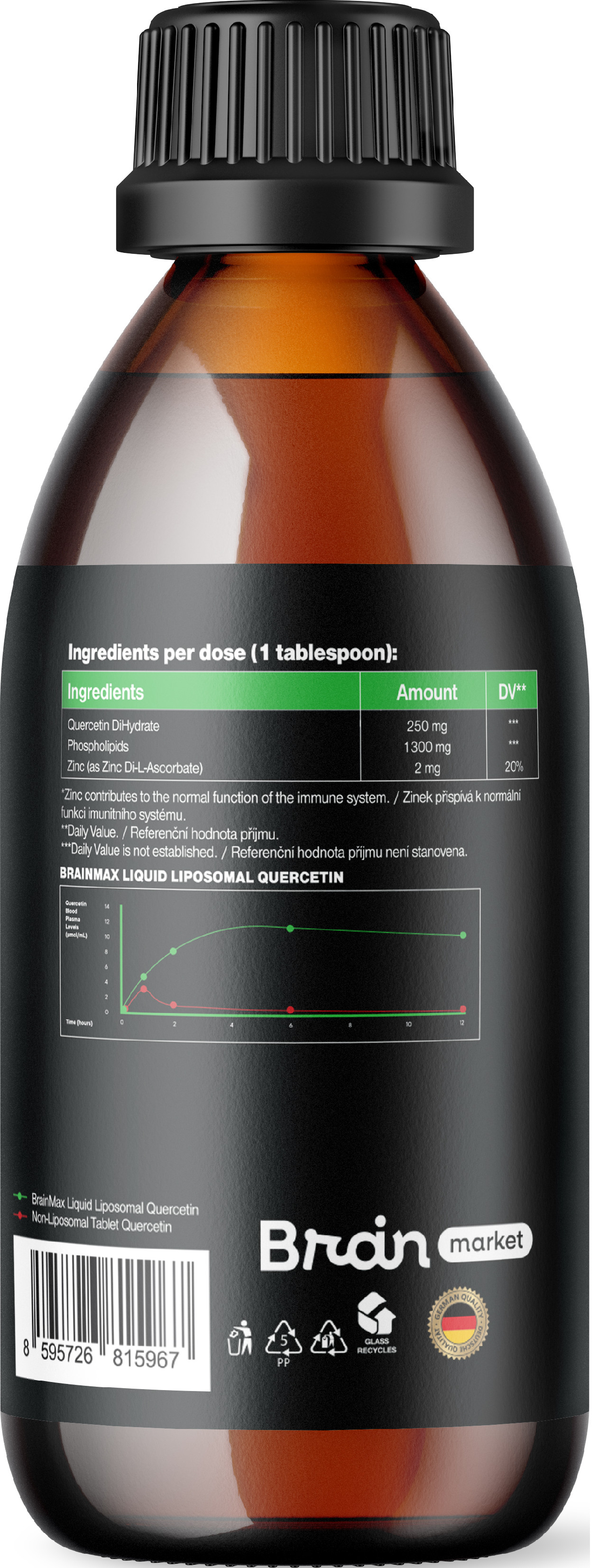 Quercetin, přirozeně se vyskytující flavonoid, je známý svou nízkou biodostupností, což znamená, že tělo ho špatně absorbuje z běžných doplňků. V tradičních formách je špatně rozpustný a rychle se vylučuje. Studie porovnávající BrainMax Liquid Liposomal Quercetin s běžnou tabletovou formou však ukázala zásadní zlepšení. Liposomální Quercetin měl až 11,6× vyšší biodostupnost a jeho koncentrace v krvi zůstala zvýšená po celých 12 hodin. To znamená, že tělo má k dispozici více účinné látky po delší dobu, což zaručuje lepší využitelnost a efektivitu produktu.