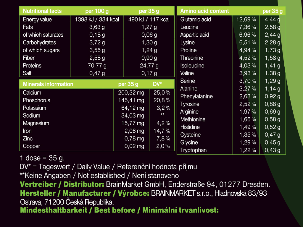 Dávkování: Rozmíchejte 1 odměrku (35g) s 200 ml vody nebo mléka. S ohledem na denní příjem bílkovin, užívejte 1-3 dávky denně.