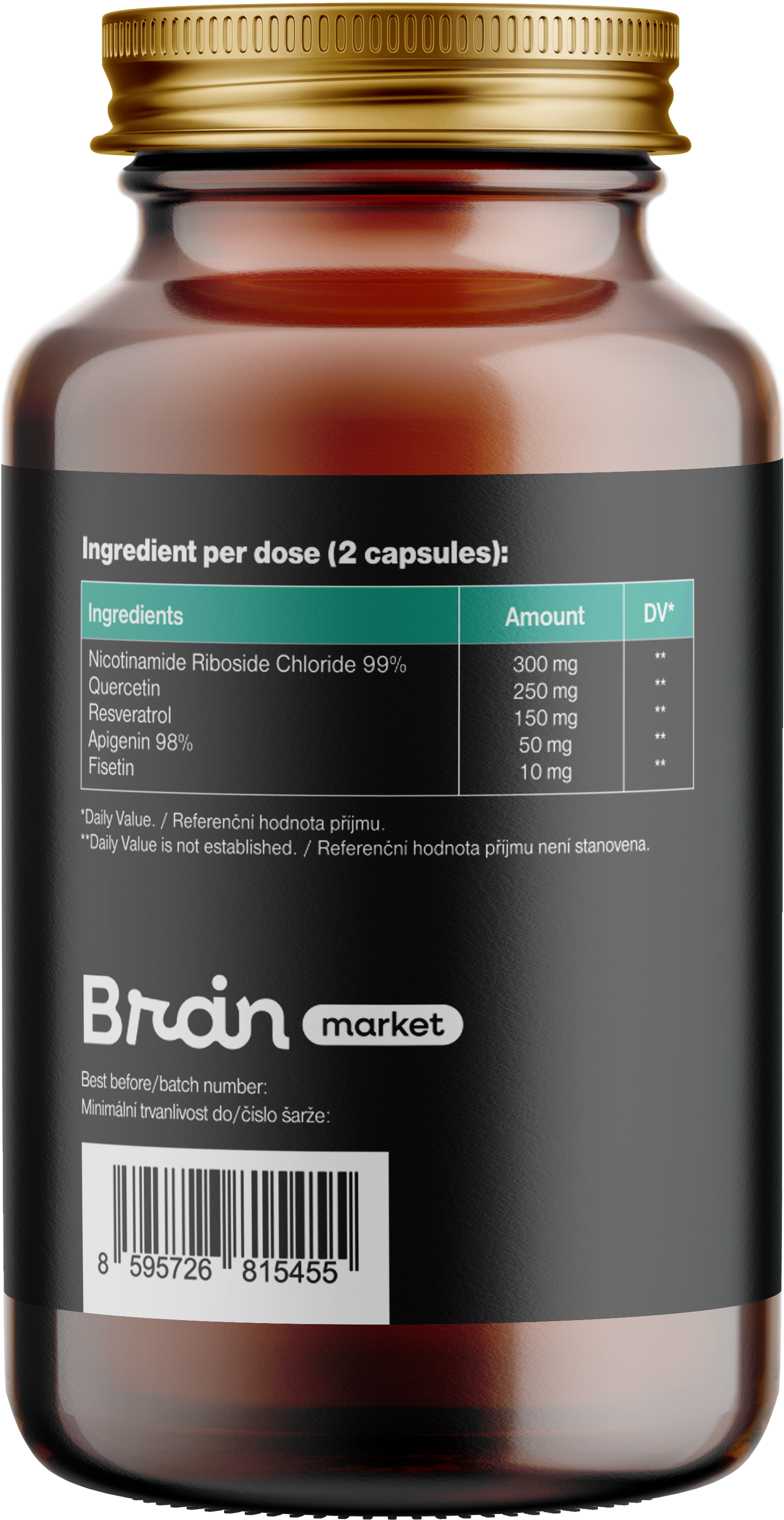 Složení (2 kapsle): Nikotinamid ribosid chlorid (300 mg, RHP **), kvercetin (250 mg, RHP **), resveratrol (150 mg, RHP **), apigenin (50 mg, RHP **), fisetin (10 mg, RHP **). Rostlinná kapsle na bázi HPMC. Bez obsahu balastních látek.