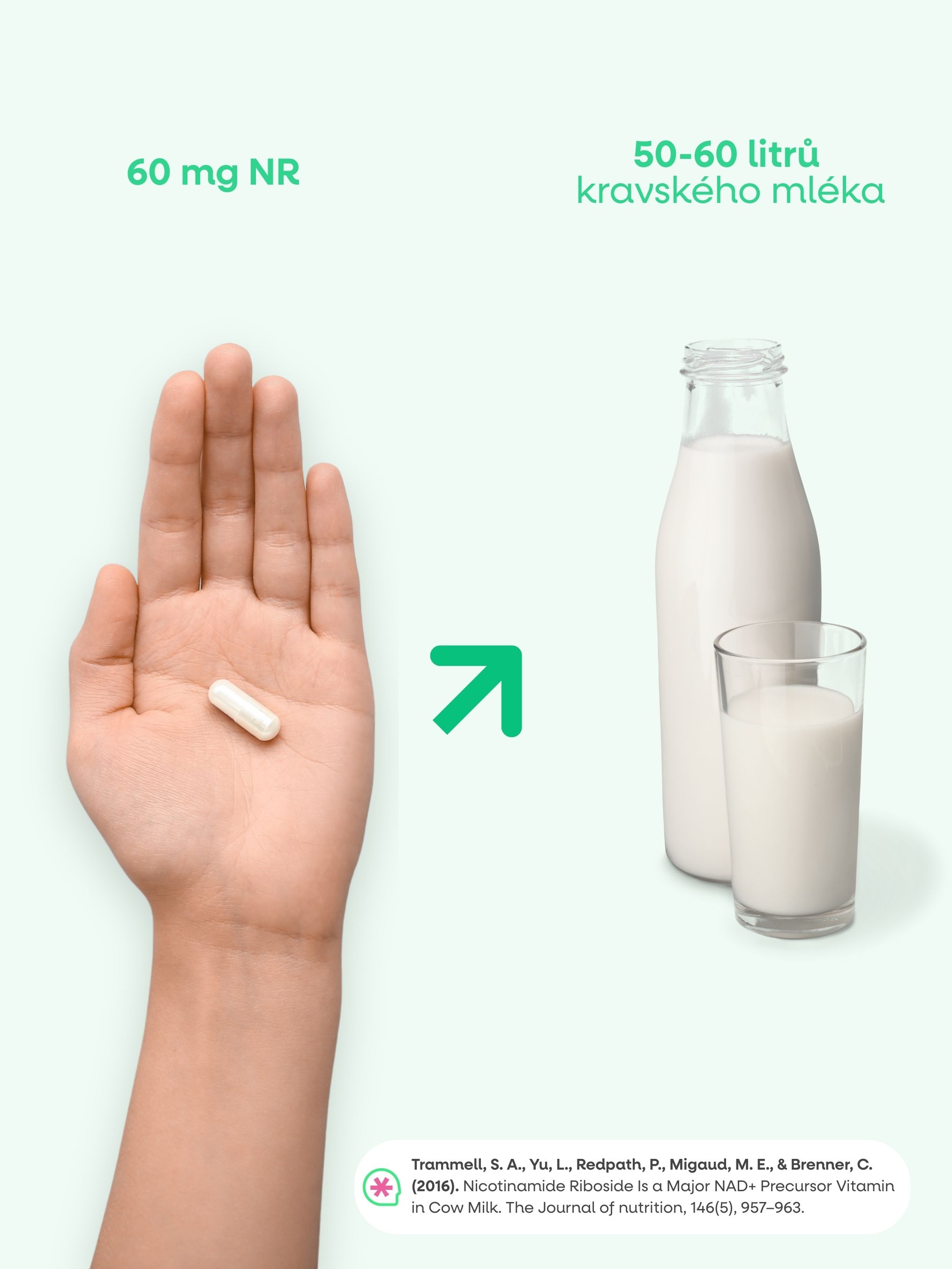 NR hraje klíčovou roli v energetickém metabolismu1. NR v kombinaci s polyfenoly, jako je resveratrol a quercetin, vytváří komplexní základ moderních suplementačních protokolů. Dávka 300 mg odpovídá přibližně 100 mg niacinu. Oproti niacinu ale nezpůsobuje zarudnutí pokožky a je tak vhodný pro dlouhodobé užívání.