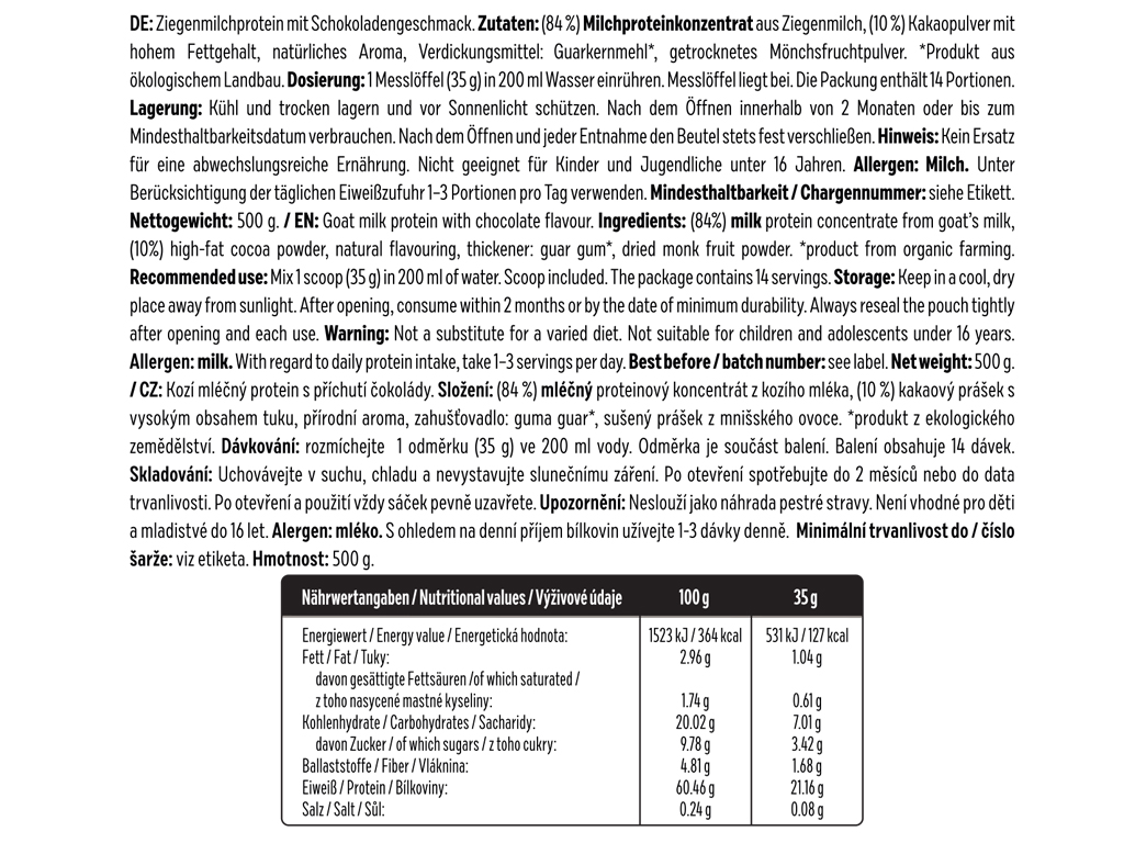 Složení: (84 %) mléčný proteinový koncentrát z kozího mléka, (10 %) kakaový prášek s vysokým obsahem tuku, přírodní aroma, zahušťovadlo: guma guar*, sušený prášek z mnišského ovoce. *produkt z ekologického zemědělství. Alergen: mléko.