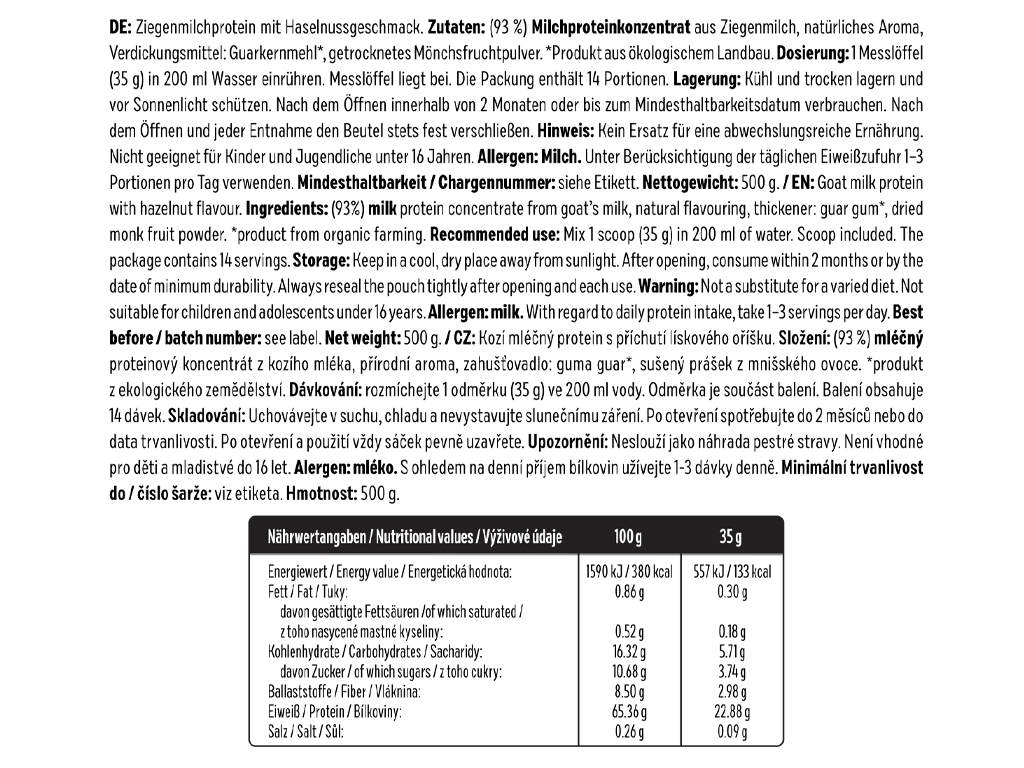 Složení: (93 %) mléčný proteinový koncentrát z kozího mléka, přírodní aroma, zahušťovadlo: guma guar*, sušený prášek z mnišského ovoce. *produkt z ekologického zemědělství. Alergen: mléko.