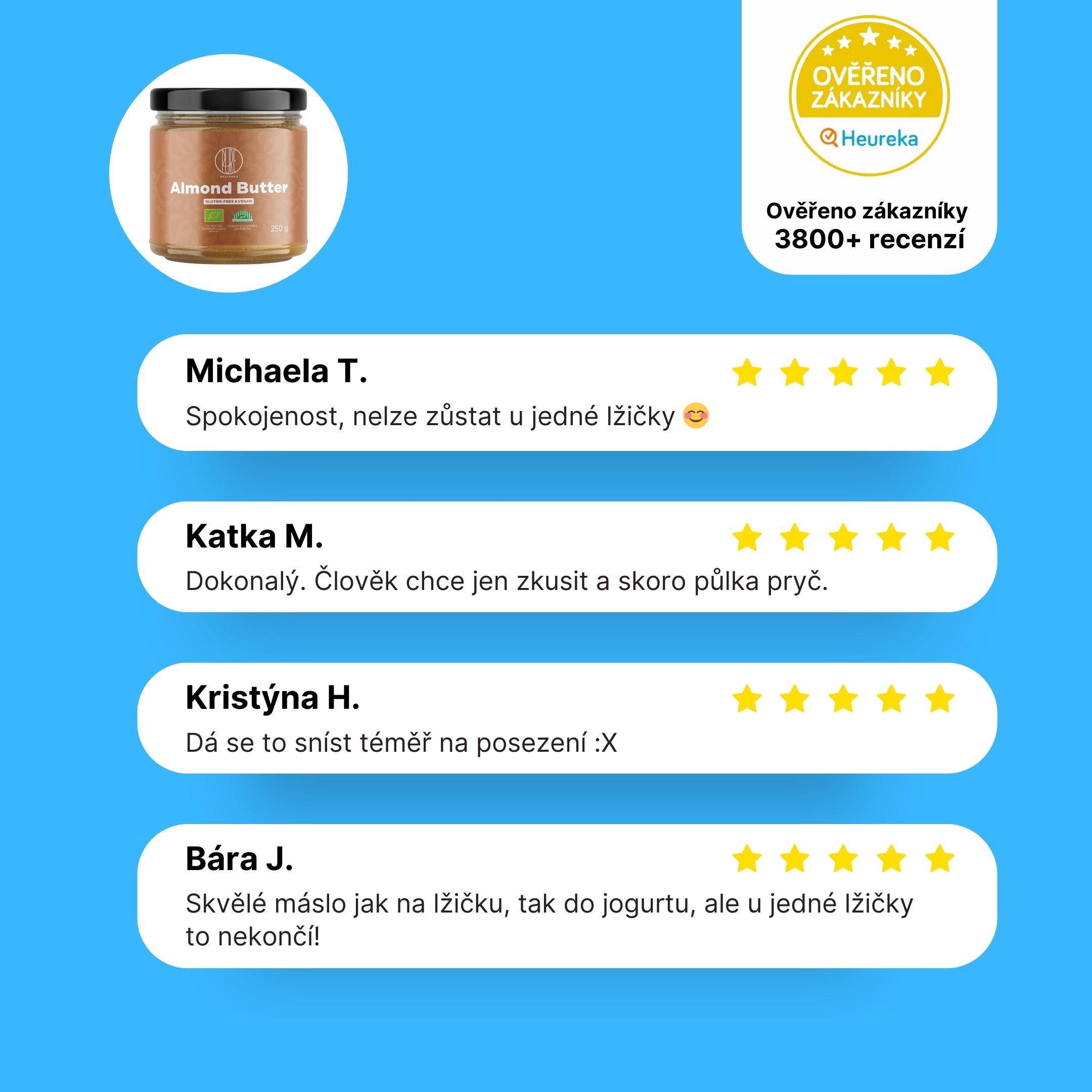 Nový mandlový krém je rozplývající se na jazyku a bez přidání palmového nebo jiného oleje! Použití BIO blanšírovaných mandlí zaručuje tu nejjemnější strukturu a zachování naprosto dokonalé lehce nasládlé chuti mandlí. A to vše bez přidání cukru, škrobů, aromat či emulgátorů.