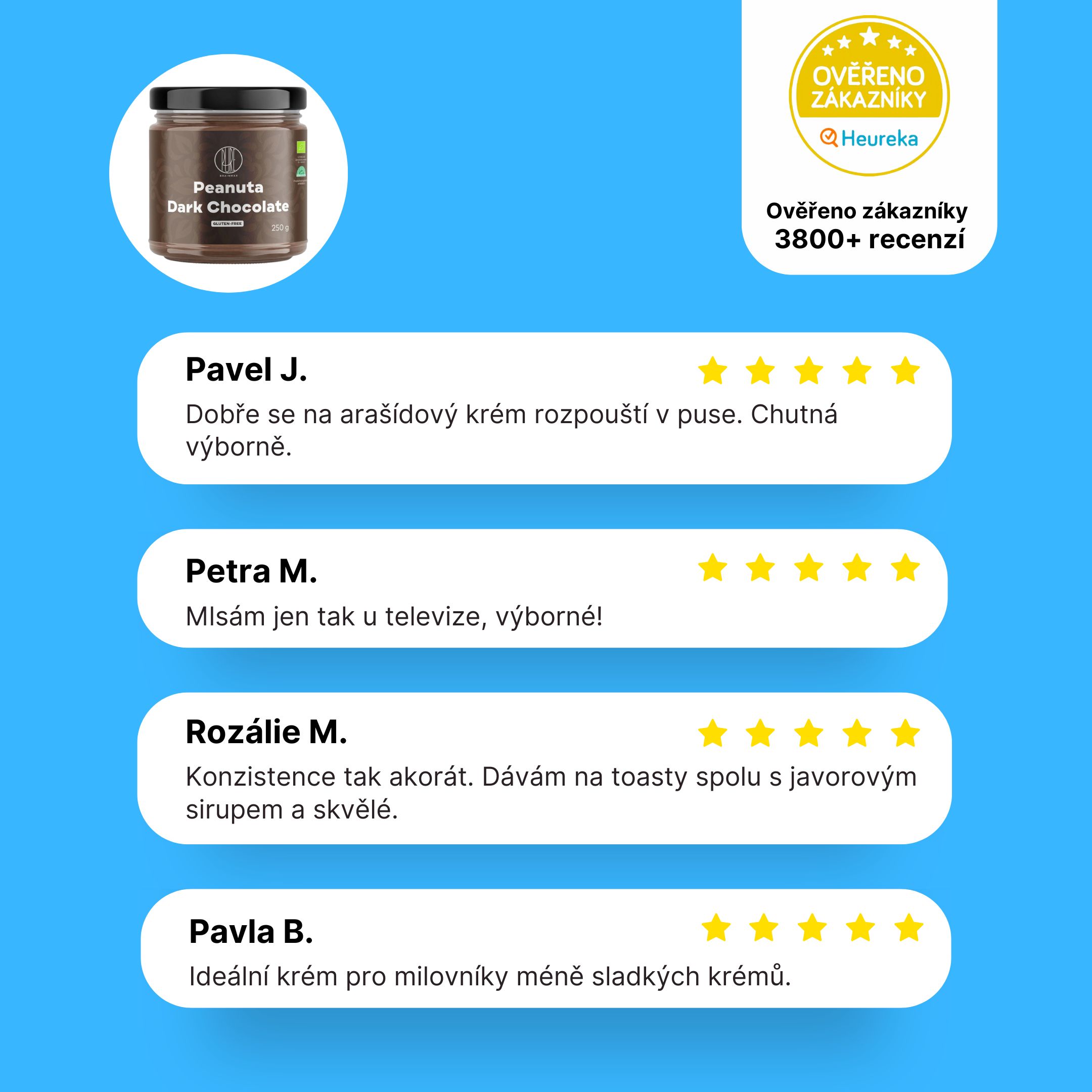 Kromě intenzivní chuti obsahuje arašídový krém zdraví prospěšné nenasycené mastné kyseliny a je plné rostlinných bílkovin. Krémy každý den vyrábíme čerstvé a jen z těch nejkvalitnějších surovin. Na jeho složení jsme si dali opravdu záležet a tvoří jej pouze vybrané arašídy a pořádná porce hořké čokolády!
