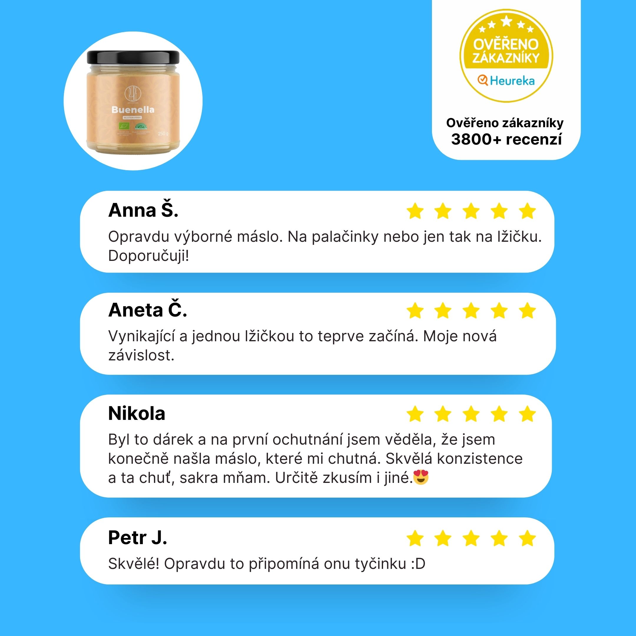 Vynikací chuť i jemná konzistence dělá z Buenelly pochoutku do všech sladkých jídel jako jsou lívance či palačinky, ale také i do vašich zdravých snídaní s granolou či vločkami. Buenella je lahodná kombinace organických lískových oříšků a BIO bílé čokolády. To z ní dělá nebezpečně jednoduchou pochoutku.