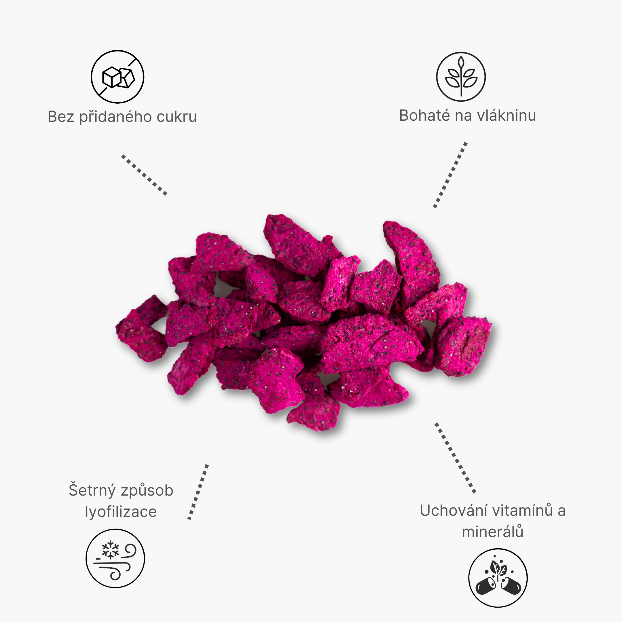 Lyofilizace je šetrná metoda sušení ovoce mrazem, při níž dochází k odstranění téměř veškeré vody prostřednictvím sublimace. Tento proces umožňuje zachovat specifickou chuť, barvu a především důležité vitamíny a minerály dračího ovoce. Kromě toho si lyofilizované ovoce uchovává dlouhou trvanlivost a křupavou konzistenci. Lyofilizované dračí ovoce je ideální jako přísada do snídaňových kaší, smoothie, nebo jako samostatná zdravá svačina plná exotické chuti.