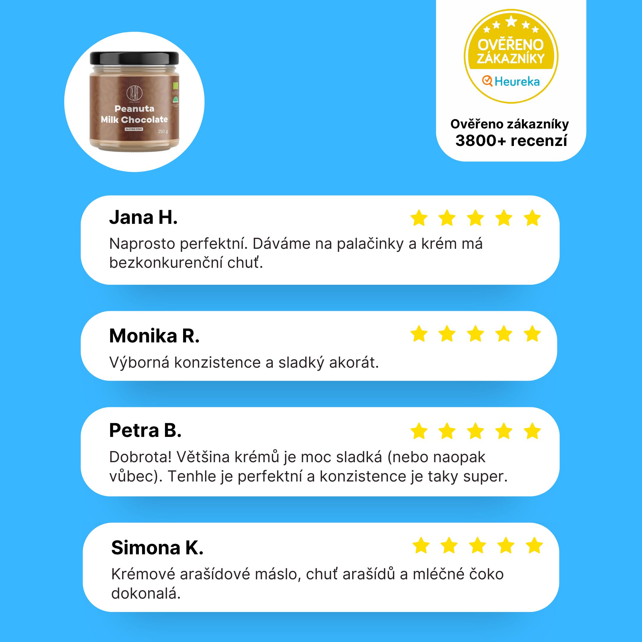 Peanuta obsahuje pouze BIO arašídy a BIO mléčnou čokoládu prvotřídní kvality. Krém má vysoký podíl bílkovin (22 g na 100 g), vlákniny (7 g na 100 g) a neobsahuje žádná aditiva jako je palmový olej nebo škroby. Díky tomu má velmi intenzivní chuť, kterou si zamilujete po první lžičce!