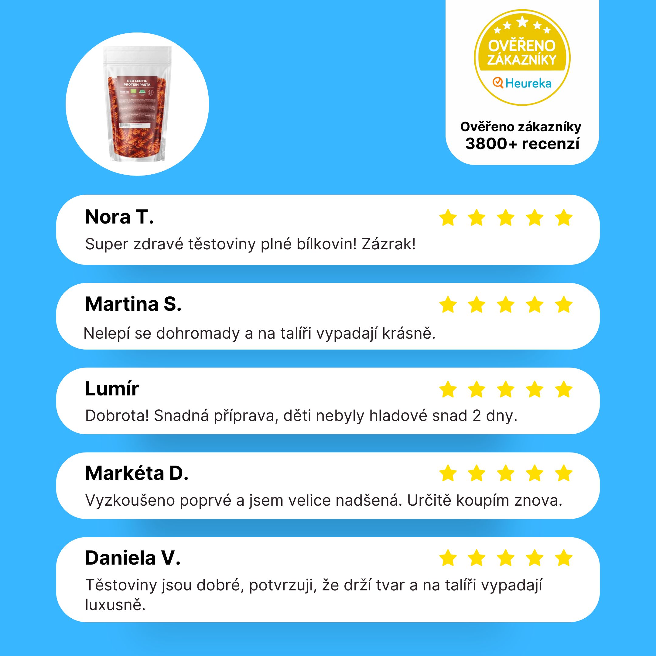 Naše proteinové těstoviny jsou vyrobeny z BIO mouky z červené čočky, doplněné o kvalitní hrachový protein. Díky vysokému obsahu rostlinných bílkovin (33,8 g / 100 g) a přirozenému obsahu vlákniny (5,2 g) představují výživově bohatou alternativu k běžným pšeničným těstovinám. Jsou ideální pro aktivní životní styl a přípravu moderních jídel – například s rajčatovou omáčkou, bazalkovým pestem nebo jako základ těstovinového salátu.