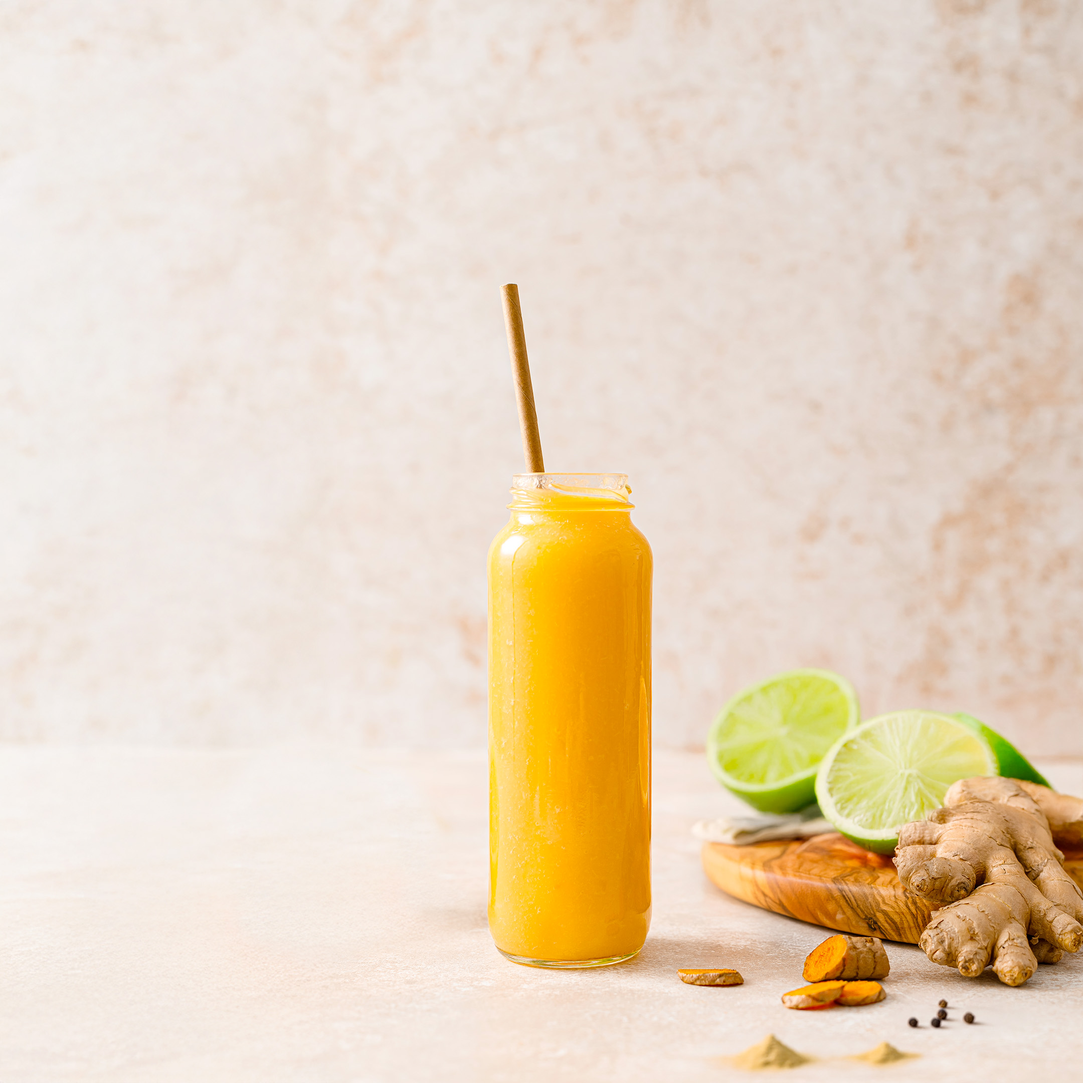 Do sklenice s filtrovanou vodou vymačkejte celou limetku. Přidejte půl lžičky mleté kurkumy, zázvoru, lžičku glutaminu, aceroly, špetku himalajské soli, trochu černého pepře.