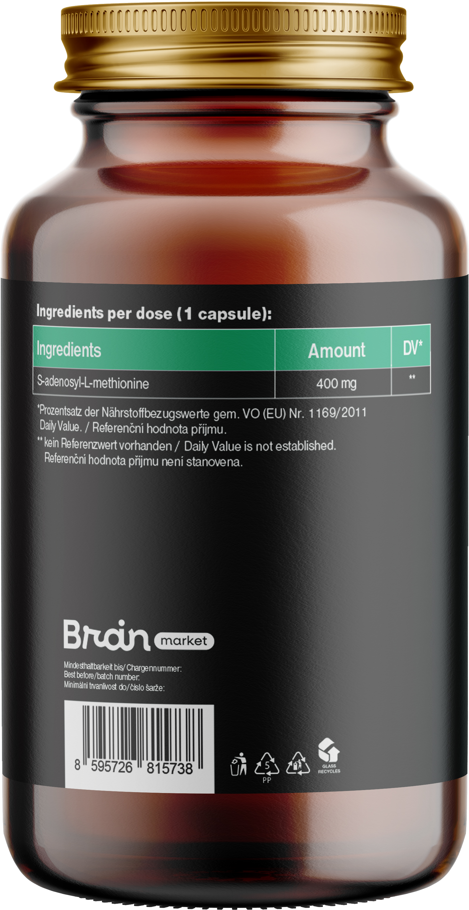 Složení v dávce (1 kapsle): S-adenosyl-L-methionine (400 mg, RHP **), stabilizátor a protispékavá látka: mikrokrystalická celulóza a oxid křemičitý. Rostlinná kapsle na bázi HPMC. Může obsahovat stopy vajec, sóji a mléka. Součástí balení je silikagel.