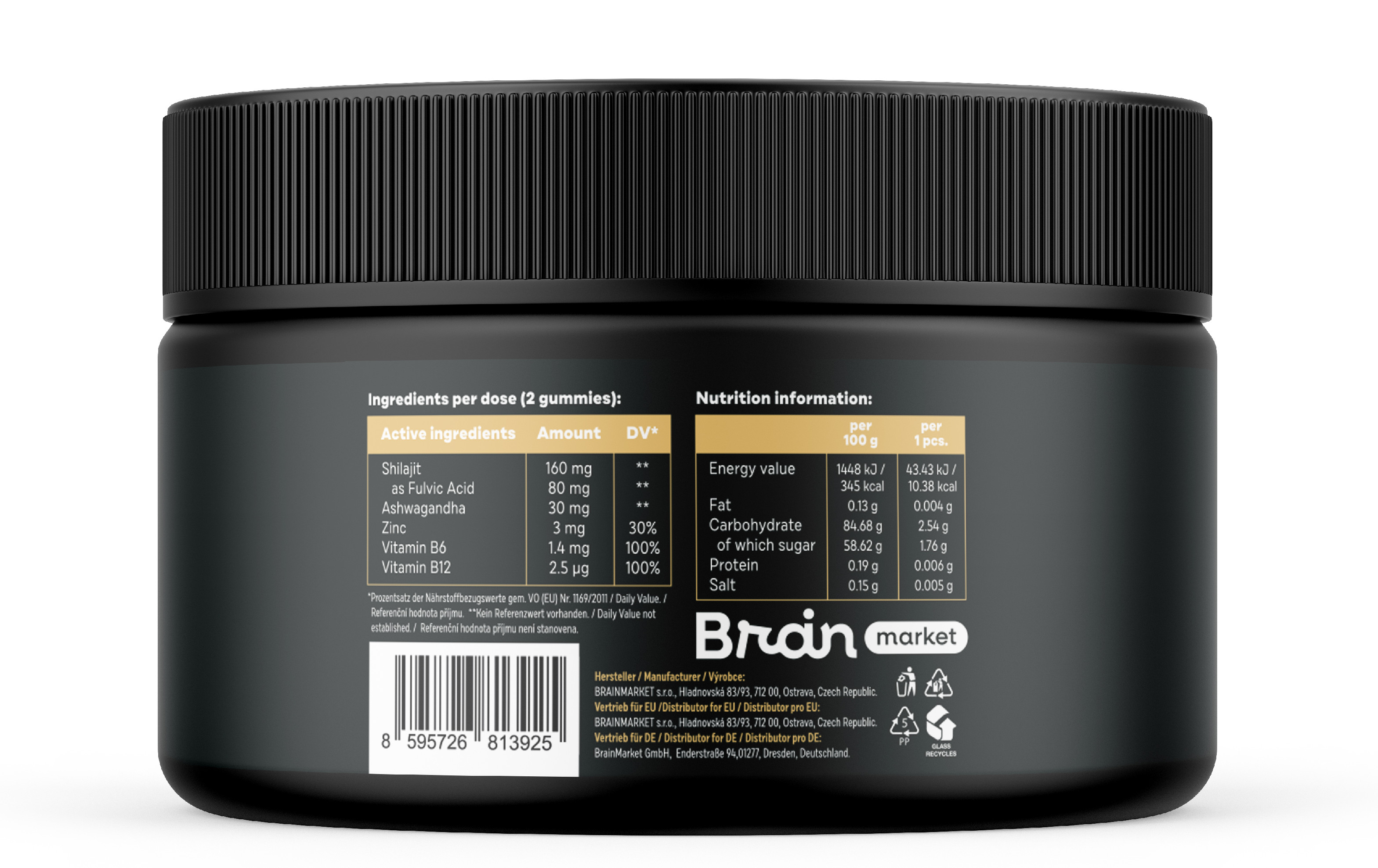 Složení na jeden bonbón: Glukózový sirup, cukr, voda, extrakt ze shilajitu 10:1 (80 mg, RHP **), kyselina fulvová 50 % (40 mg, RHP **), želírující látka (pektin), regulátory kyselosti (kyselina citronová, citrát sodný), extrakt z ašvagandy 10:1 (15 mg, RHP **), přírodní aroma z černého rybízu, citrát zinečnatý (1,5 mg, RHP* 15 %), obarveno hroznovými slupkami, povlaková látka (rostlinný olej – kokosový, řepkový), karnaubský vosk, vitamin B12 (kyanokobalamin) (1,25 µg, RHP* 50 %), vitamin B6 (pyridoxinhydrochlorid) (0,7 mg, RHP* 50 %). Může obsahovat lepek, korýše, ryby, mléko a sóju. Bez balastních látek.