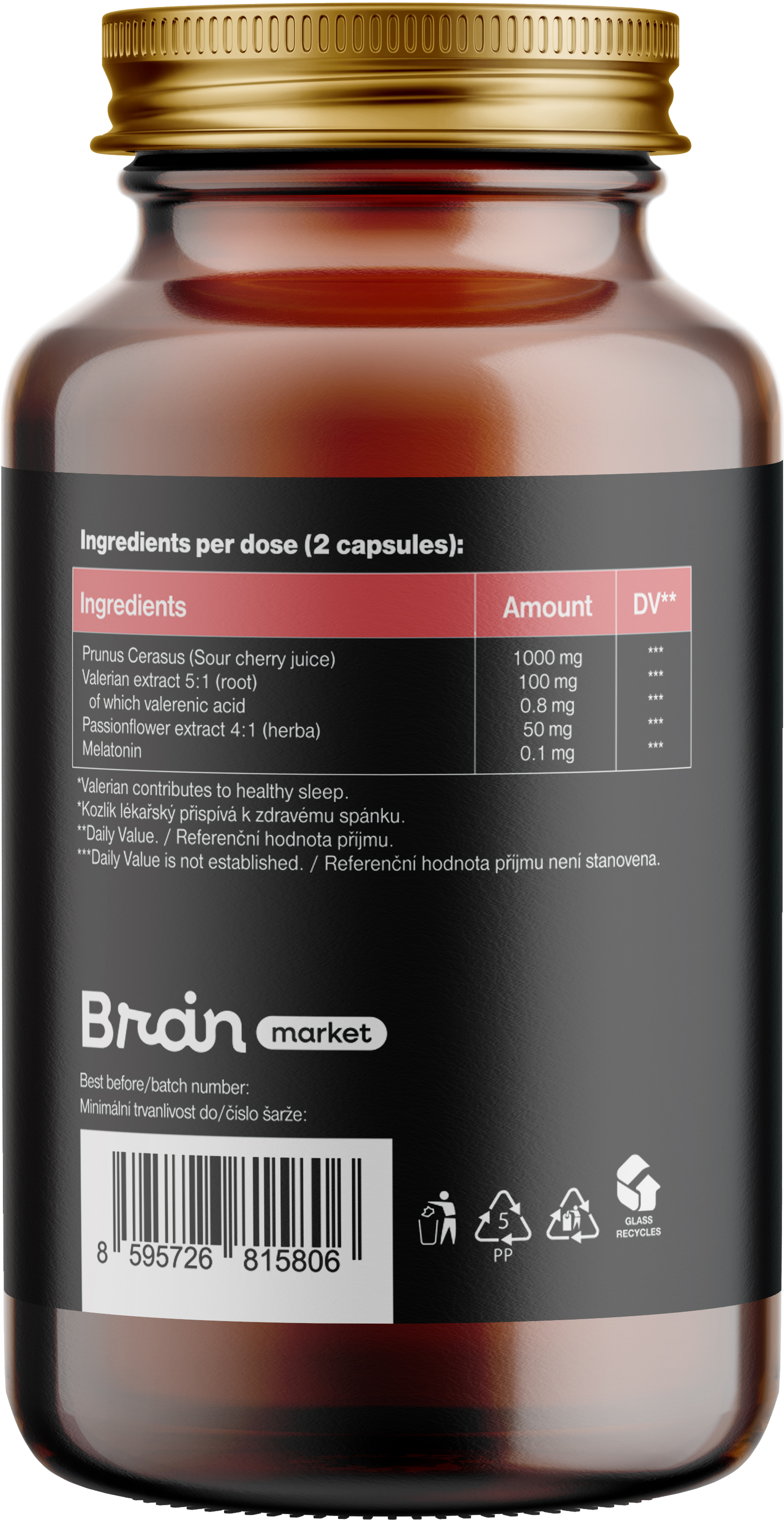 Složení: Šťáva z višně (1000 mg, RHP **), extrakt z kořene kozlíku lékařského 5:1 (100 mg, RHP **) – z toho kyselina valerenová (0,8 mg, RHP **), extrakt z mučenky pletní 4:1 (nadzemní část) (50 mg, RHP **), melatonin (0,1 mg, RHP **), maltodextrin, rostlinná kapsle na bázi HPMC.