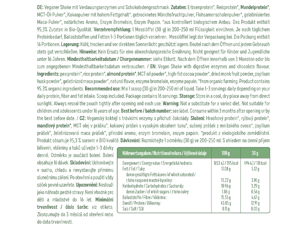 Složení: Hrachový protein*, rýžový protein*, mandlový protein*, MCT olej v prášku*, kakaový prášek s vysokým obsahem tuku*, sušený prášek z mnišského ovoce*, psyllium prášek*, želatinizovaná maca prášek*, přírodní aroma, enzym bromelain, enzym papain. *produkt z ekologického zemědělství. Produkt obsahuje 95,3 % surovin v BIO kvalitě. Alergeny jsou ve složení zvýrazněny tučně.