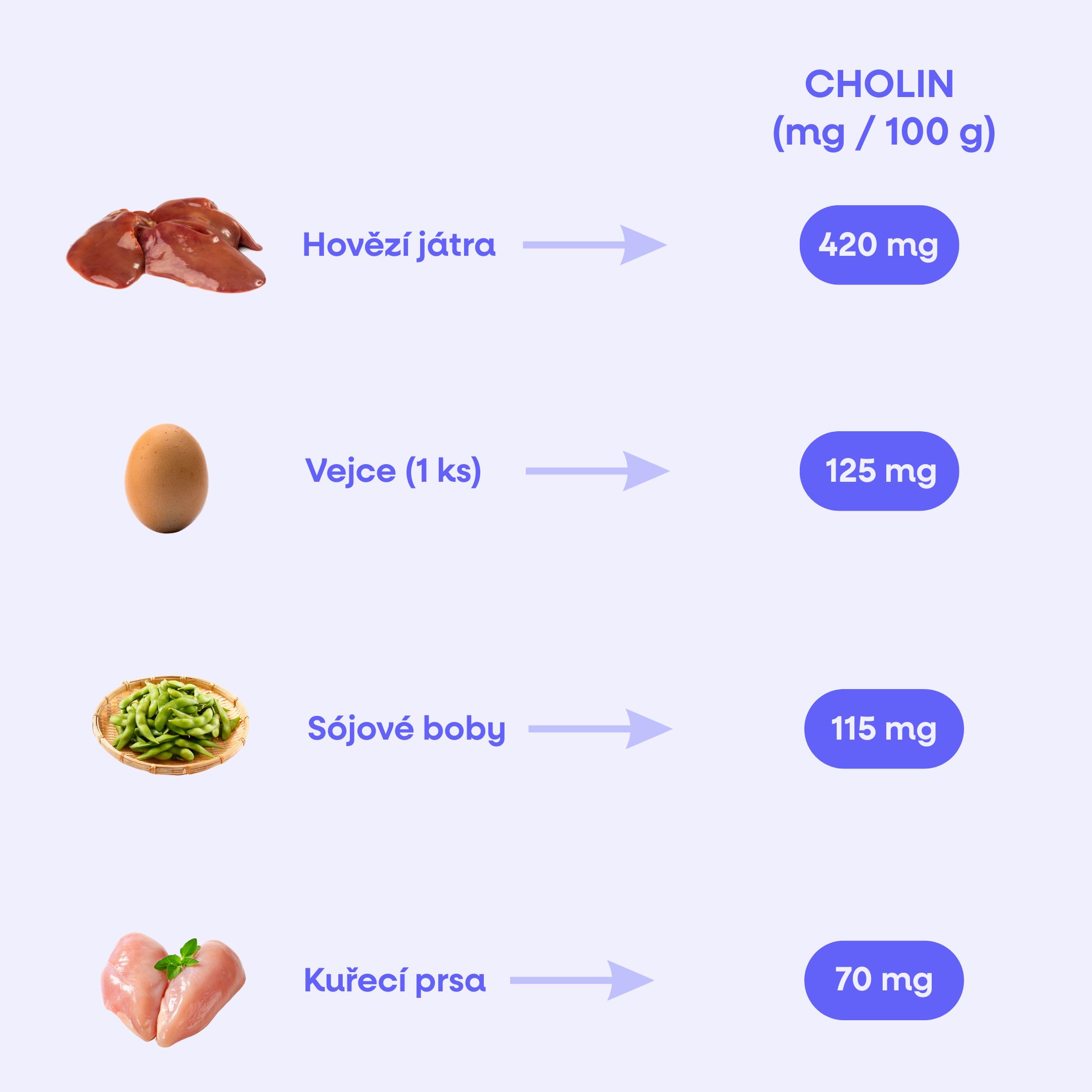 Cholin je látka velice podobná skupině vitamínů B a najdeme ji v běžných potravinách, zejména těm bohatým na tuky a bílkoviny. Mezi nejbohatší zdroje patří vejce a játra, ale cholin najdeme i v lososu, brokolici, soji i mléčných výrobcích. Proč je ale tedy jeho příjem občas nedostatečný? Zejména kvůli zvýšeným nárokům např. v těhotenství, při vnitřním napětí nebo fyzické zátěži a tělo ho nedokáže přijmout v dostatečném množství. U veganů a vegetariánů je příjem cholinu ještě nižší.