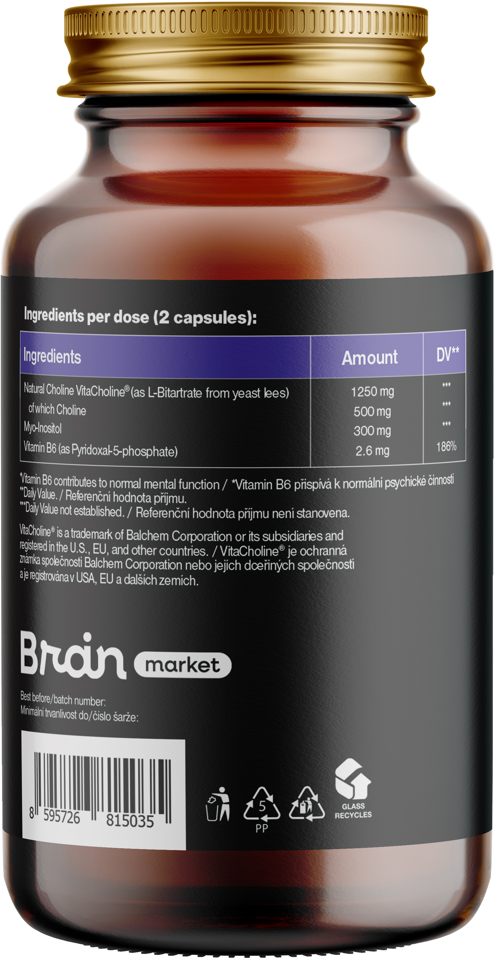 Složení v dávce (2 kapsle): přírodní cholin VitaCholine® (jako L-bitartát získaný fermentací z kvasinek) (1250 mg, RHP **), z toho cholin (500 mg, RHP **), Myo-Inositol (300 mg, RHP **), vitamín B6 (jako pyridoxal-5-fosfát) (2,6 mg, RHP* 186 %). Rostlinná kapsle na bázi HPMC. Bez obsahu balastních látek.