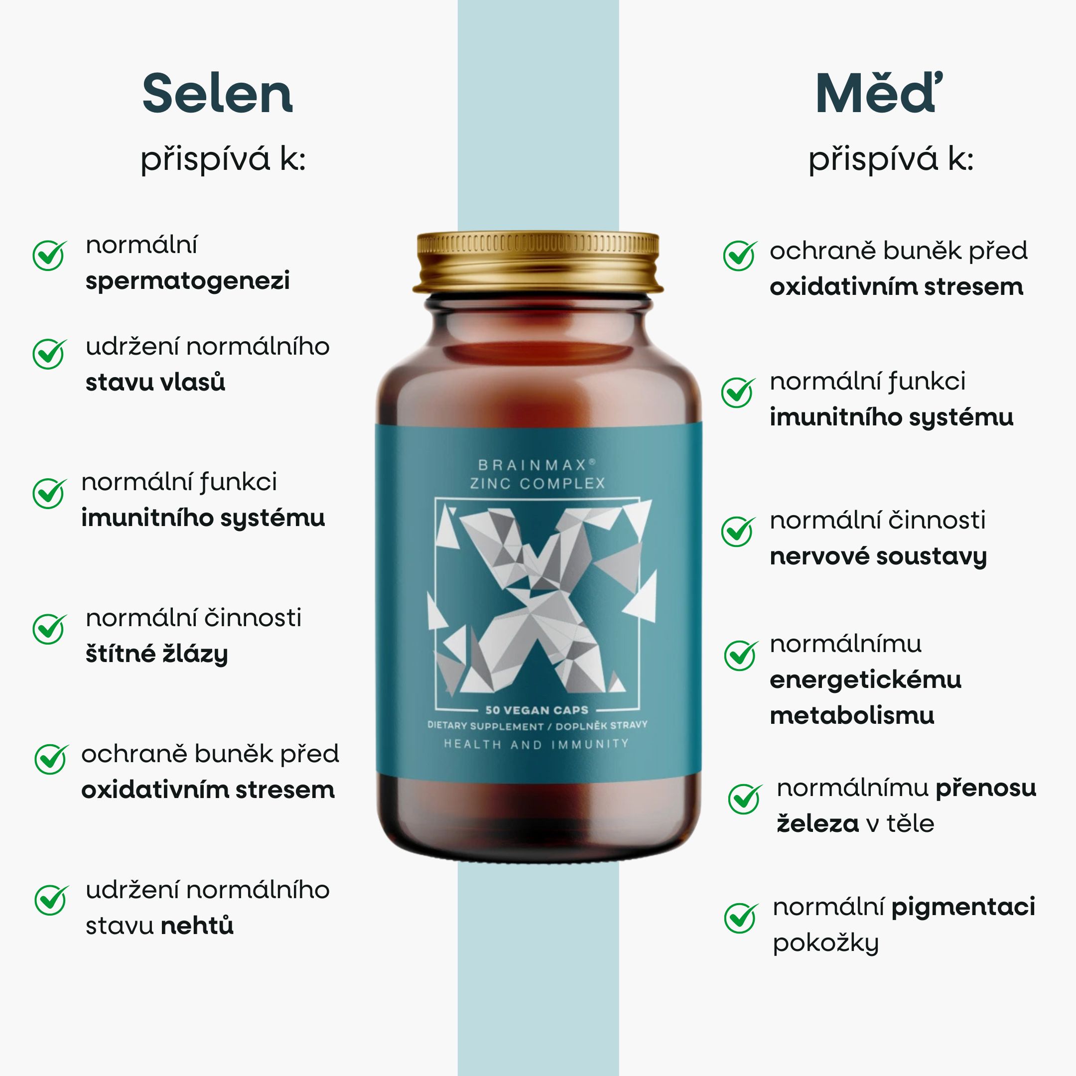 Kromě zinku obsahuje komplex také měď a selen – minerály, které se navzájem doplňují a přispívají k udržení rovnováhy v těle. Měď přispívá k normální činnosti nervové soustavy a přenosu železa v těle. Selen (v biologicky aktivní formě selenmethioninu) přispívá k normální činnosti štítné žlázy, k udržení normálního stavu vlasů a nehtů a spermatogenezi. Všechny látky v komplexu přispívají k normální funkci imunitního systému1,2,3 a k ochraně buněk před oxidativním stresem1,2,3.