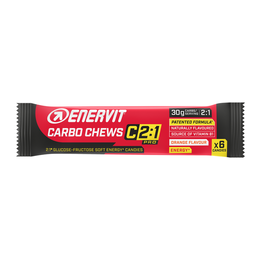 Enervit Carbo Chews obsahují 30 g sacharidů v poměru 2:1 (glukóza:fruktóza) na 6 želatinek a jsou vhodné pro doplnění sacharidů během fyzické aktivity. Díky nulovému obsahu bílkovin a tuků je jejich trávení snadné. Želatinky umožňují flexibilní dávkování, sníte jen tolik, kolik právě potřebujete. Pomerančová příchuť dodává příjemnou chuť a skvěle doplňuje další produkty Enervit.