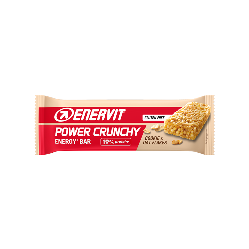 Enervit Power Crunchy Bar kombinuje výbornou chuť s kvalitní výživou. Obsahuje 19 g bílkovin na 100 g, je obohacena o hořčík, který přispívá ke snížení míry únavy a vyčerpání, a vitamin B1, jenž podporuje normální energetický metabolismus. Základ tvoří kakaové sójové lupínky a bezlepkové ovesné, kukuřičné a rýžové vločky, doplněné o hydrolyzovanou čekankovou vlákninu a křupavou tmavou čokoládu. Neobsahuje lepek, a je tedy vhodná i pro osoby s celiakií nebo intolerancí na lepek.