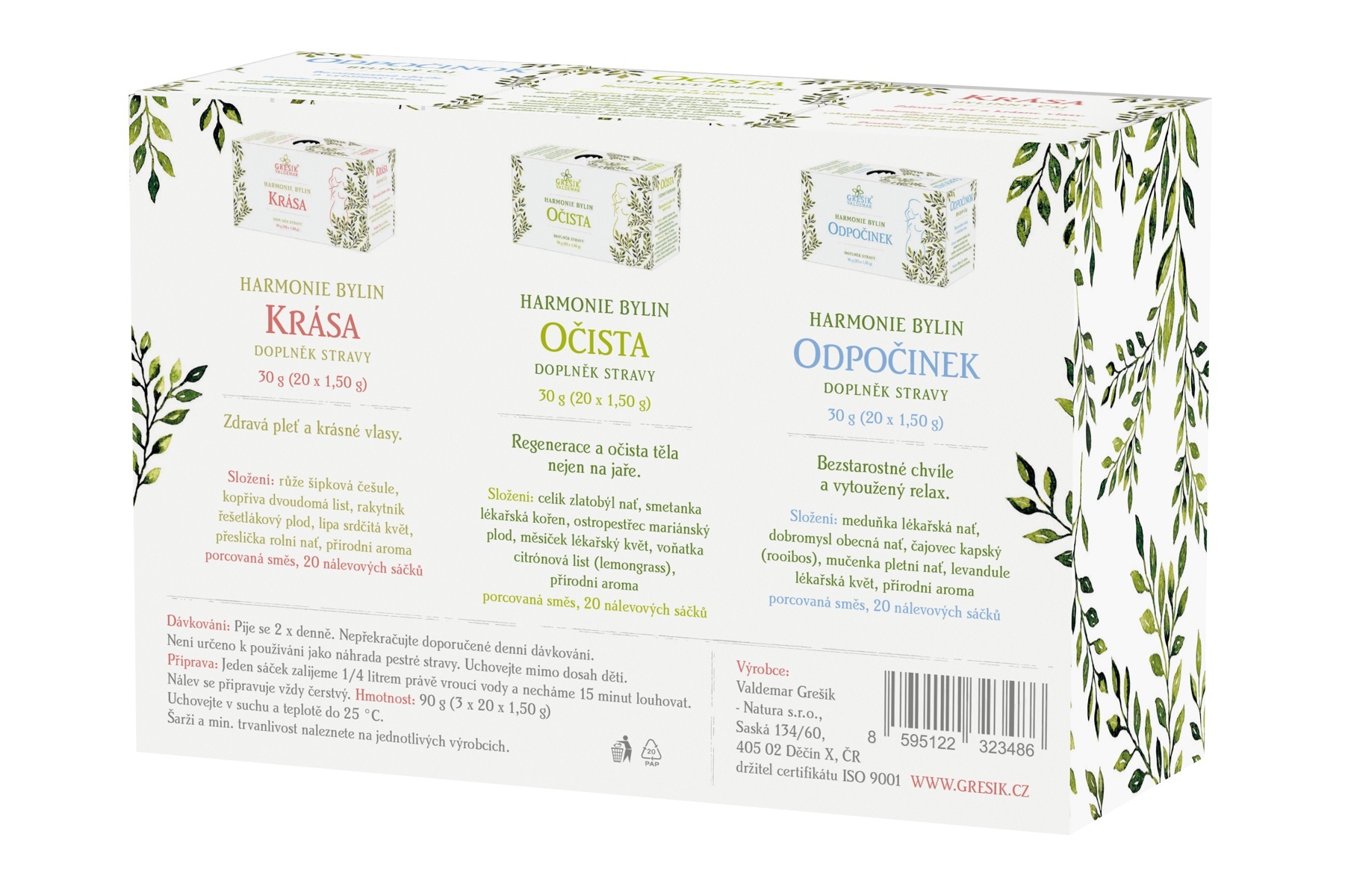 Bylinné čaje pro spokojené, vyrovnané a sebevědomé ženy v každém věku. Obsahuje 3 druhy čajů z řady Harmonie bylin: Krása, Očista a Odpočinek