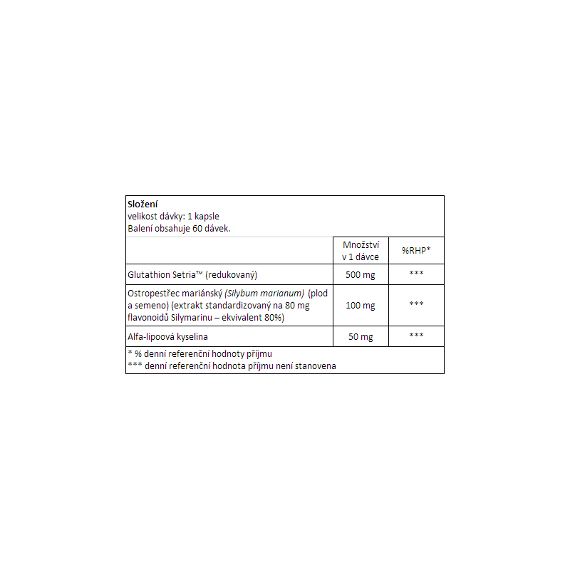 | Ostropestřec mariánský (Silybum marianum) (plod a semeno) (extrakt standardizovaný na 80 mg flavonoidů Silymarinu – ekvivalent 80%) | 100 mg | *** |