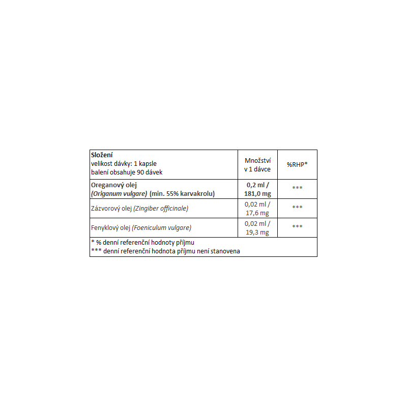 | Oreganový olej (Origanum vulgare) (min. 55% karvakrolu) | 0,2 ml / 181,0 mg | *** |
