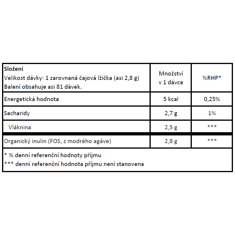 | Organický inulin (FOS, z modrého agáve) | 2,8 g | *** |