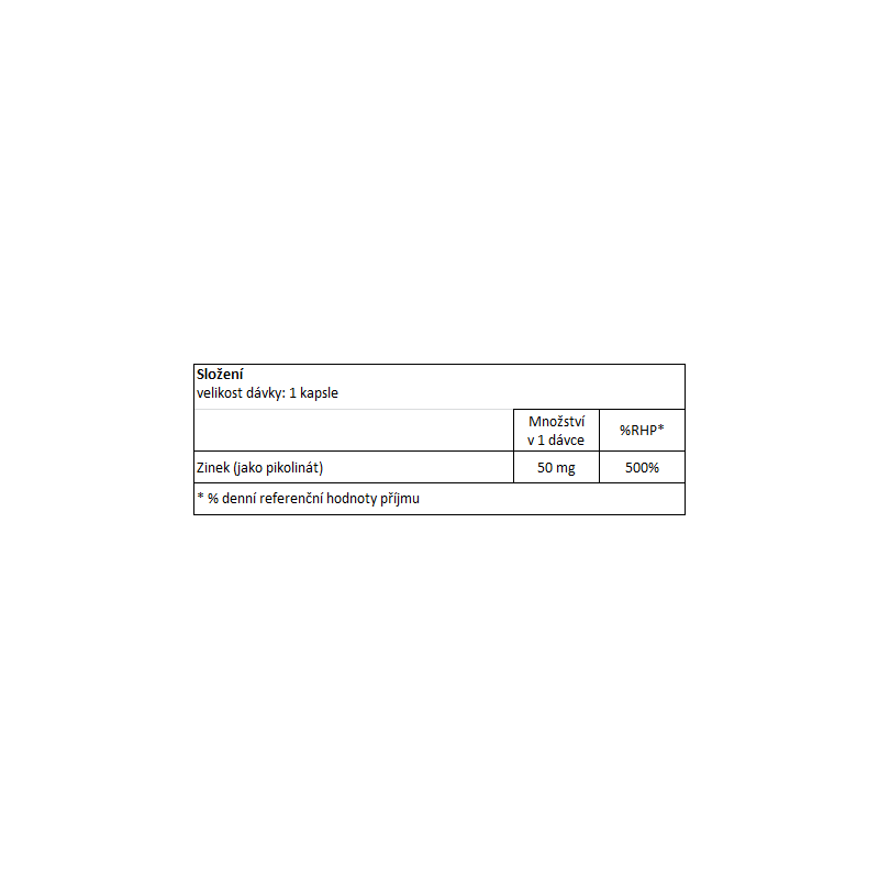 | Zinek (jako pikolinát) | 50 mg | 500 % |